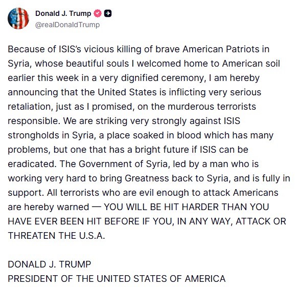 ABD Başkanı Donald Trump, Suriye’nin Tedmur (Palmira) bölgesinde 2’si asker 3 ABD vatandaşının hayatını kaybettiği saldırının ardından yaptığı açıklamada, “Bu, terör örgütü DEAŞ’ın ABD’ye ve Suriye’ye yönelik bir saldırısıydı” ifadelerini kullanmıştı. Suriye Devlet Başkanı Ahmed eş-Şara’nın bu saldırı yüzünden son derece öfkeli ve rahatsız olduğunu kaydeden Trump, “Buna çok ciddi bir yanıt verilecek” demişti.