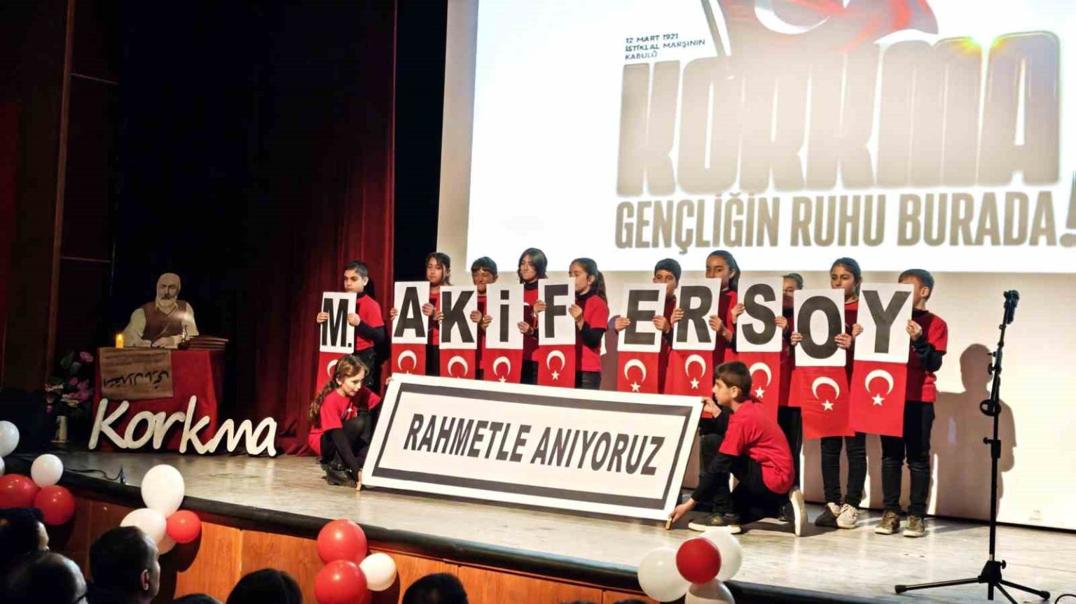 Ahlat Halk Eğitimi Merkezi Müdürlüğü konferans salonunda düzenlenen program, Vakıfbank İlkokulu ve Ertuğrulgazi Ortaokulu tarafından hazırlandı. Saygı duruşu ve İstiklal Marşı’nın okunmasıyla başlayan program, günün anlam ve önemini belirten konuşmayla devam etti. Daha sonra Mehmet Akif Ersoy’un hayatının anlatıldığı video gösterimi yapıldı. Ardından program, öğrenciler tarafından şiirlerin okunması, bayrak gösterisi ve oratoryo gösterileriyle devam etti.