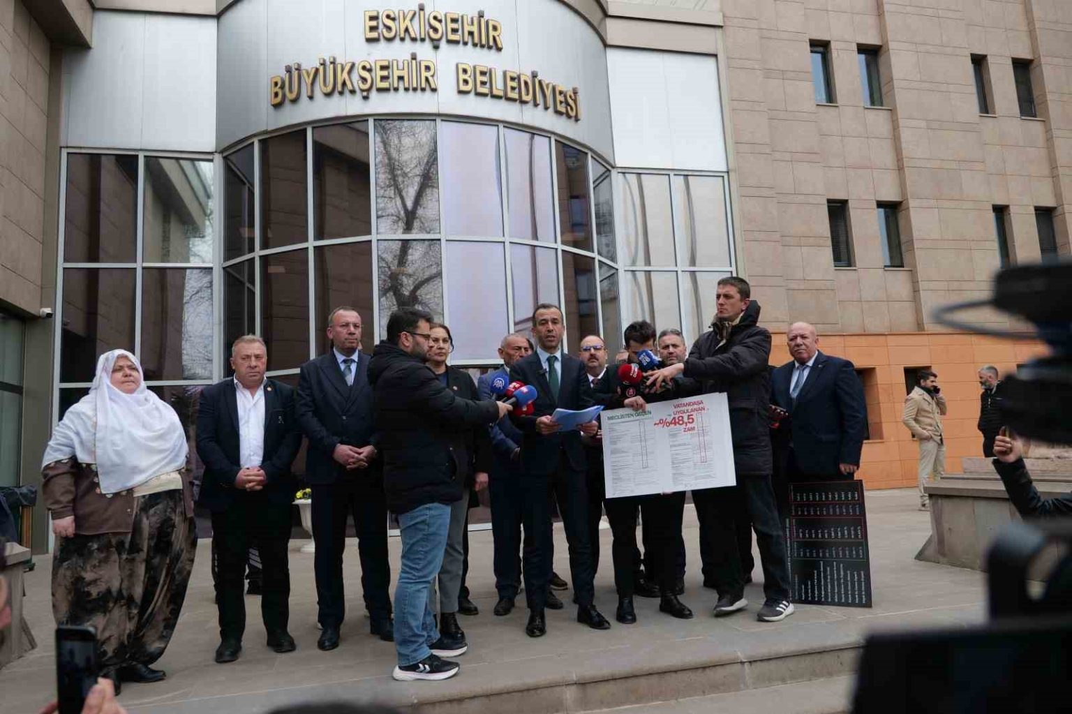 Meclis üyeleri Büyükşehir Belediye binası önünde toplanırken, açıklama Eskişehir Büyükşehir Belediyesi Meclisi AK Parti Grup Başkan Vekili Ahmet Dönmez tarafından yapıldı. ESKİ Genel Müdürlüğü Plan Bütçe Komisyonu’nda müzakere edilen ve imza altına alınan, komisyondan geldiği gibi mecliste onaylanan fiyat tarifeleri ile şu an yürürlükte olan tarifeler arasında vahim farklılıklar bulunduğuna dair kuvvetli şüphe ve somut bulgular oluşturduğunu belirten Dönmez, “Özellikle, ESKİ Genel Müdürlüğü bünyesinde 2026 yılı itibarıyla uygulanmaya başlanan “Hizmetler ve Teminatlar” ile “Yaptırımlar” tarifelerine ilişkin; Meclis ve komisyon aşamalarında kabul edilen içerikten farklı olarak, bazı kalemlerde yaklaşık yüzde 48,5 oranında fahiş bir artış yapıldı, bu usulsüz rakamların web sitesine girilerek vatandaşa yansıtıldı. Söz konusu tarifelerin yer aldığı belge sayfalarının, meclis iradesi dışında sonradan değişikliğe uğramış olabileceğine dair güçlü emareler bulundu. Resmi evrak taleplerimize ancak 2. günde cevap verilmesi ve paylaşılan belgelerde görülen maddi hatalar, evrakların aslına uygun olmayan bir biçimde yeniden düzenlendiği kanaatini güçlendirmektedir. Bu şüphelerimizi destekleyen en somut husus ise Komisyon Kararı dosyasındaki dikkat çekici tutarsızlıklardır. Karar metninin genelinde ve “Su ve Atıksu Tarifesi” gibi diğer sayfalarda tüm komisyon üyelerinin (8 kişi) tam imzası ve parafı bulunurken; fiyatların yüzde 48,5 oranında artırıldığı kritik sayfalarda paraf sayısının 5’e düşmesi ve imza düzeninin bozulmuş olması, bu sayfaların “sonradan ihdas edildiği” yönünde açık bir emaredir” dedi.