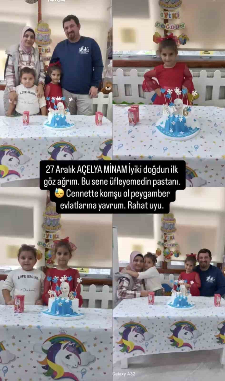 Samsun’un Canik ilçesinde, Lovelet AVM yanındaki akaryakıt istasyonunda 27 Nisan 2025 gecesi meydana gelen olayda, oto yıkama bölümünde aracını yıkayan Adem Kaya (35), kızları Açelya Mina (7) ve Ayla (5), toprak kayması sonucu göçük altında kalarak hayatlarını kaybetmiş, anne Çiğdem Kaya (31) ise yaralı olarak kurtulmuştu. Söz konusu davanın ilk duruşması 4 Aralık’ta Samsun 6. Ağır Ceza Mahkemesi’ne görülmeye başlandı. Akaryakıt istasyonu sahibi ve müdürünün yargılandığı dava ileri bir tarihe ertelenirken, hayatını kaybeden Açelya Mina Kaya yaşasaydı 8. doğum gününü kutlayacaktı. Acılı anne Çiğdem Kaya’nın sosyal paylaşım sitesinden eşi ve kızlarının da başında bulunduğu geçen yıl kutladıkları doğum günü kutlamasından fotoğraf ve üzerinde, “27 Aralık Açelya Minam iyiki doğdun ilk göz ağrım. Bu sene üfleyemedin pastanı. Cennette komşu ol peygamber evlatlarına yavrum. Rahat uyu” ve kızının mezarının yer aldığı “Doyamadım kokuna” yazısı paylaşması yürekleri dağladı.