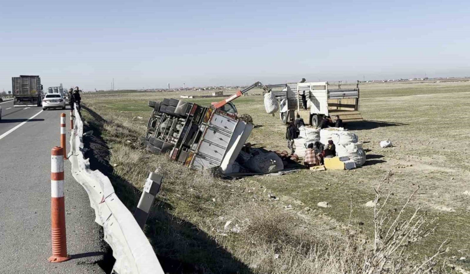 Kaza, Aksaray – Konya kara yolunun 19. kilometresinde meydana geldi. Edinilen bilgiye göre, Aksaray’dan Konya istikametine seyreden 57 yaşındaki Mehmet B. idaresindeki 15 ABF 547 plakalı kamyon, sürücünün direksiyon hakimiyetini kaybetmesi sonucu bariyere çarptıktan sonra şarampole devrildi. Kazada sürücü yaralanırken diğer araç sürücüleri durumu 112 Acil Çağrı Merkezine bildirdi. İhbar üzerine olay yerine polis ve sağlık ekibi sevk edildi. Kısa sürede olay yerine gelen sağlık ekipleri yaralı sürücüye ilk müdahaleyi ambulans içinde yaptı. Polis ekipleri yolda güvenlik önlemi alırken, yaralı sürücünün sağlık durumunun iyi olduğu öğrenildi. Dökülen patatesler ise sürücünün yakınları tarafından toplanarak başka bir kamyona yüklendi.