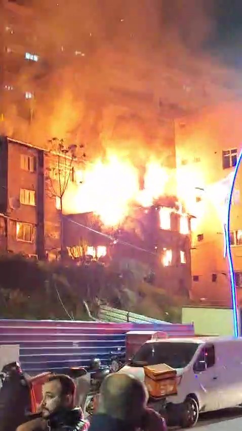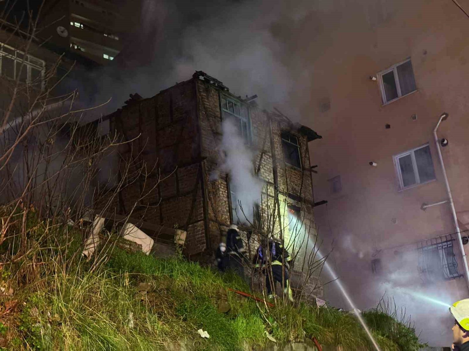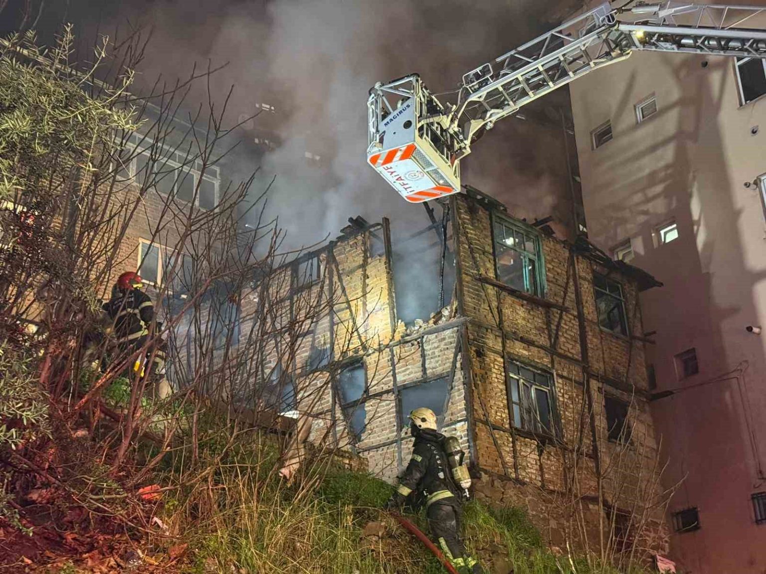 Alev alev yanan iki katlı ahşap metruk bina küle döndü