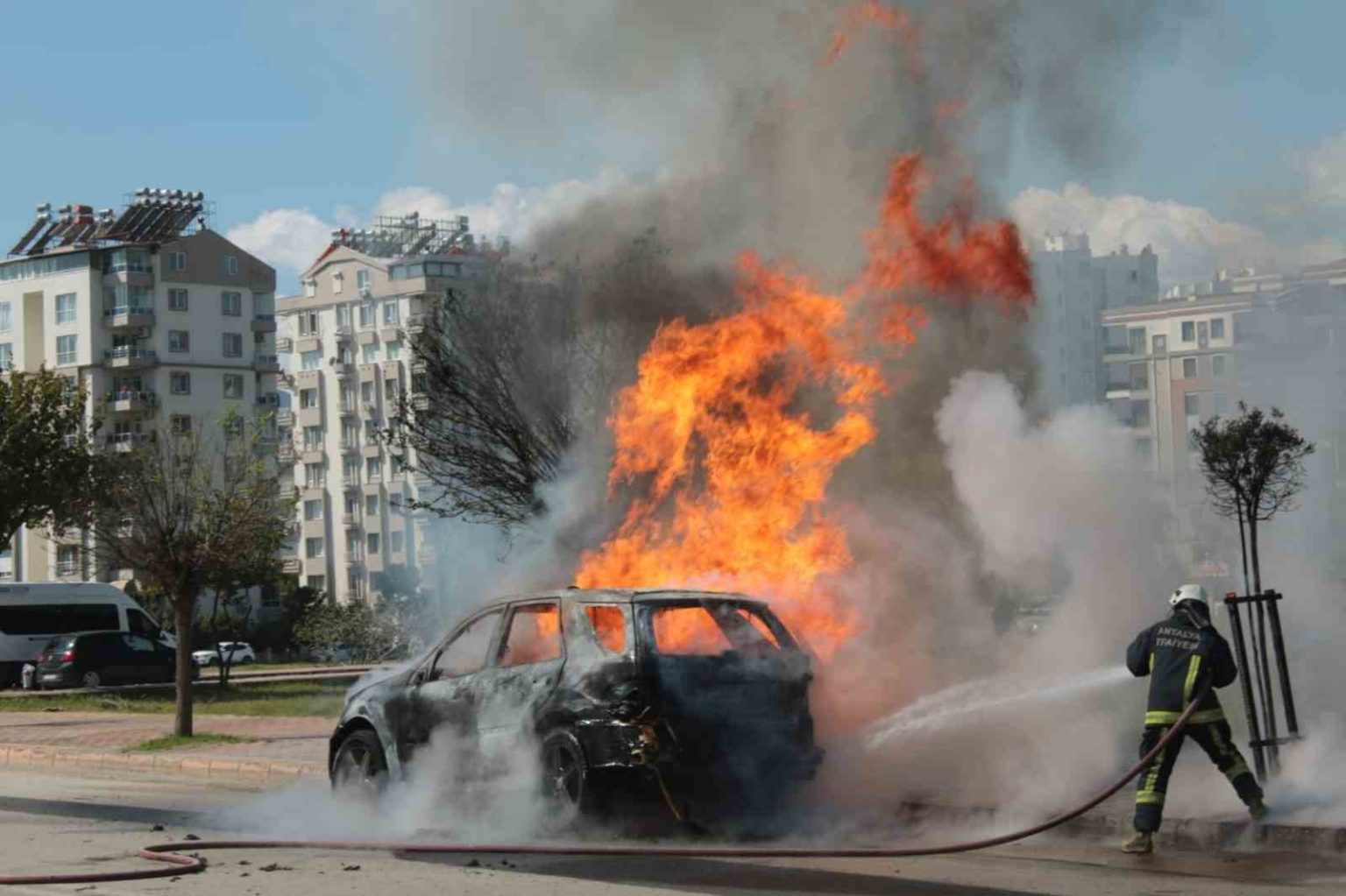 Olay, saat 11.00 sıralarında Konyaaltı ilçesi Çamlık Caddesi üzerinde meydana geldi. Edinilen bilgiye göre, 07 SG 189 plakalı Mercedes marka otomobilliyle seyreden sürücü Salih Türk (55), arka taraftan dumanların çıktığını fark edince aracı yol kenarına park etti. Türk, içerisini dumanların kapladığı otomobilden veterinere kontrole götürdüğü kedisini de alarak kendini dışarı attı. Alevler bir anda aracı kapladı. Araç sahibi ve çevredeki vatandaşların yangın tüpleri ile müdahalesi alevleri sönürmeye yeterli olmadı. İhbar üzerine adrese Antalya Büyükşehir Belediyesi İtfaiye Daire Başkanlığı ekipleri sevk edildi. Kısa sürede adrese gelen ekipler alev topuna dönen araca müdahale etti. Ekiplerin yaklaşık yarım saatlik müdahalesi ile yangın tamamen söndürülürken otomobil ise tamamen kullanılamaz hale geldi.