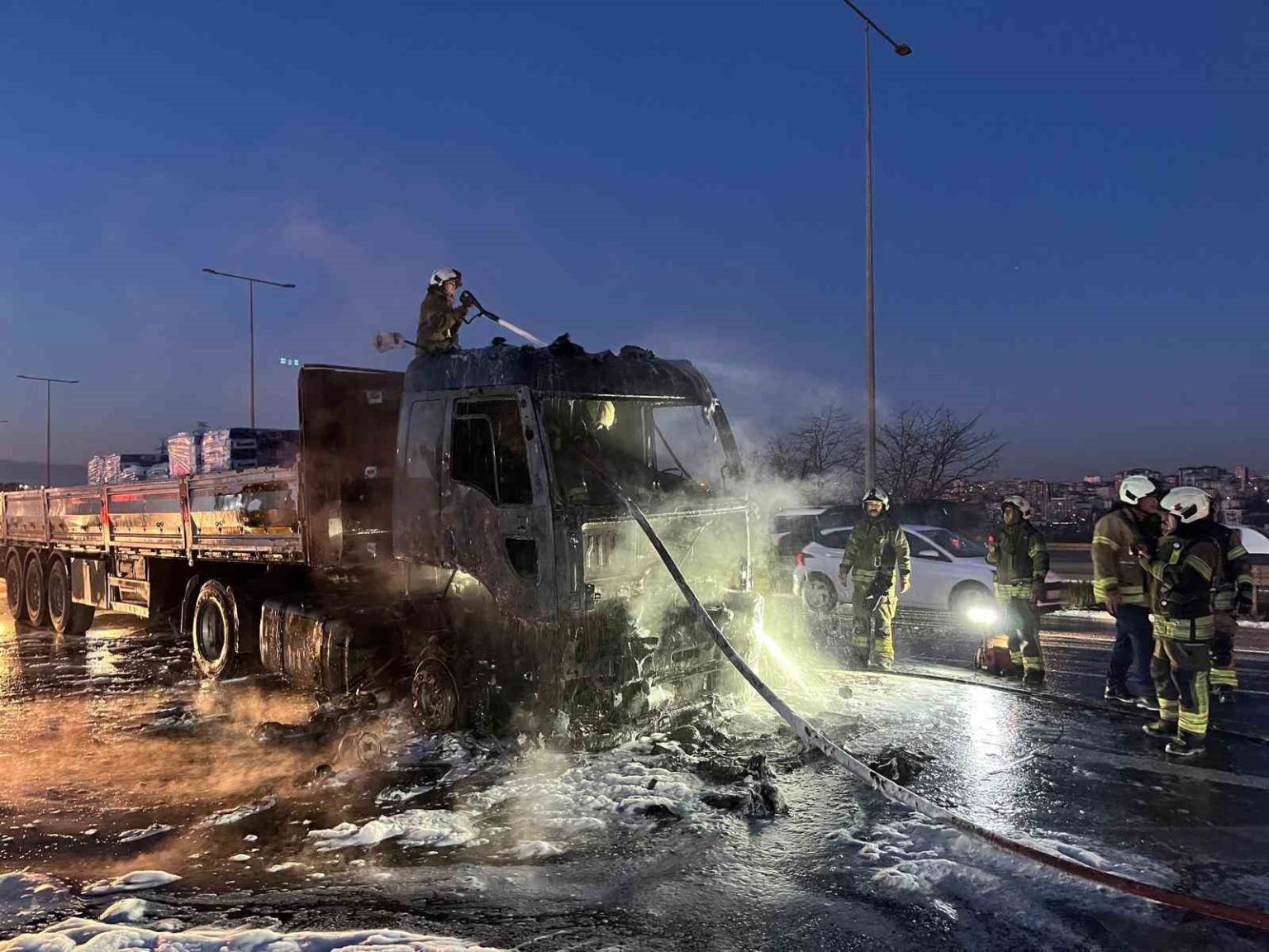 İstanbul Eyüpsultan’da alev topuna dönen tırdan geriye demir yığını kaldı.