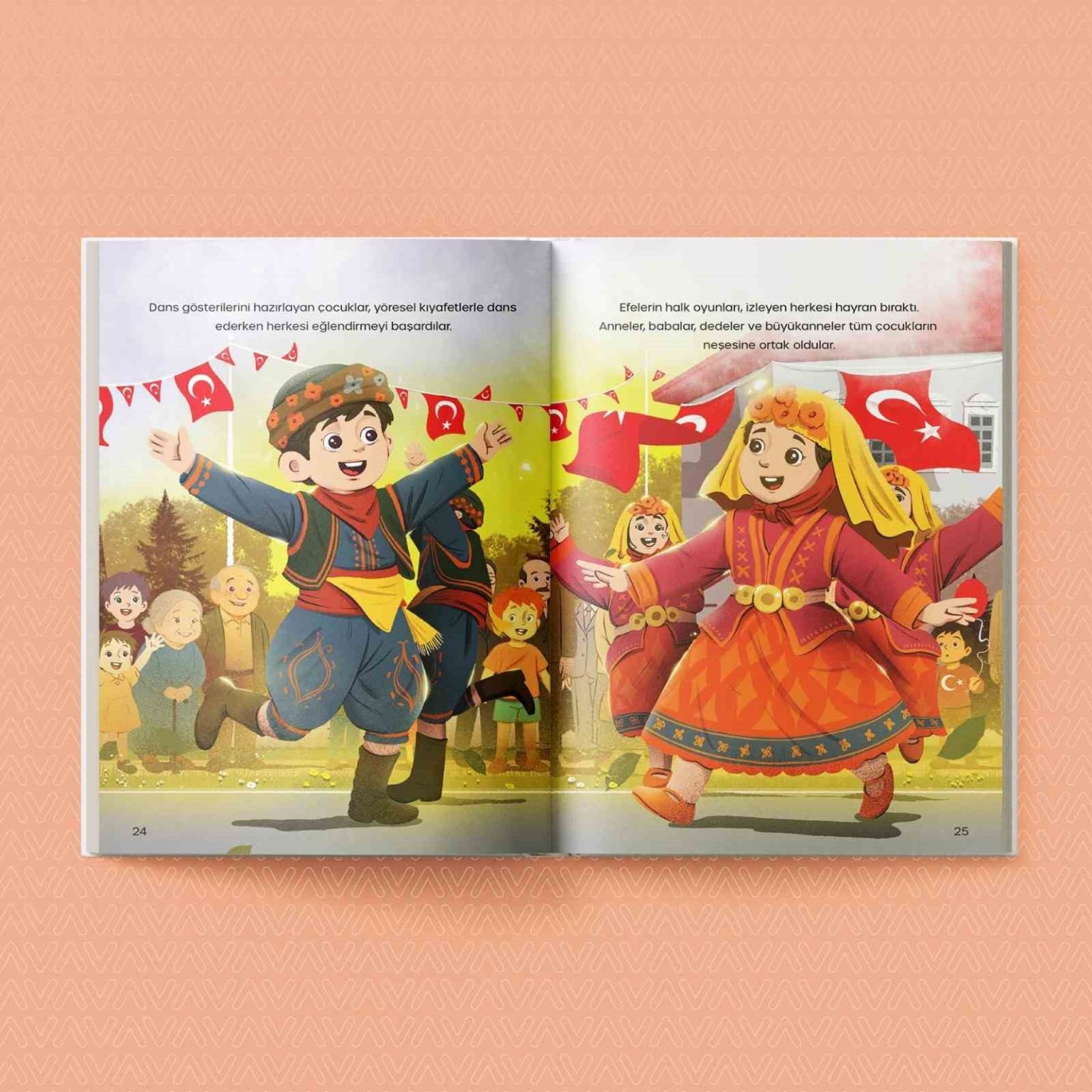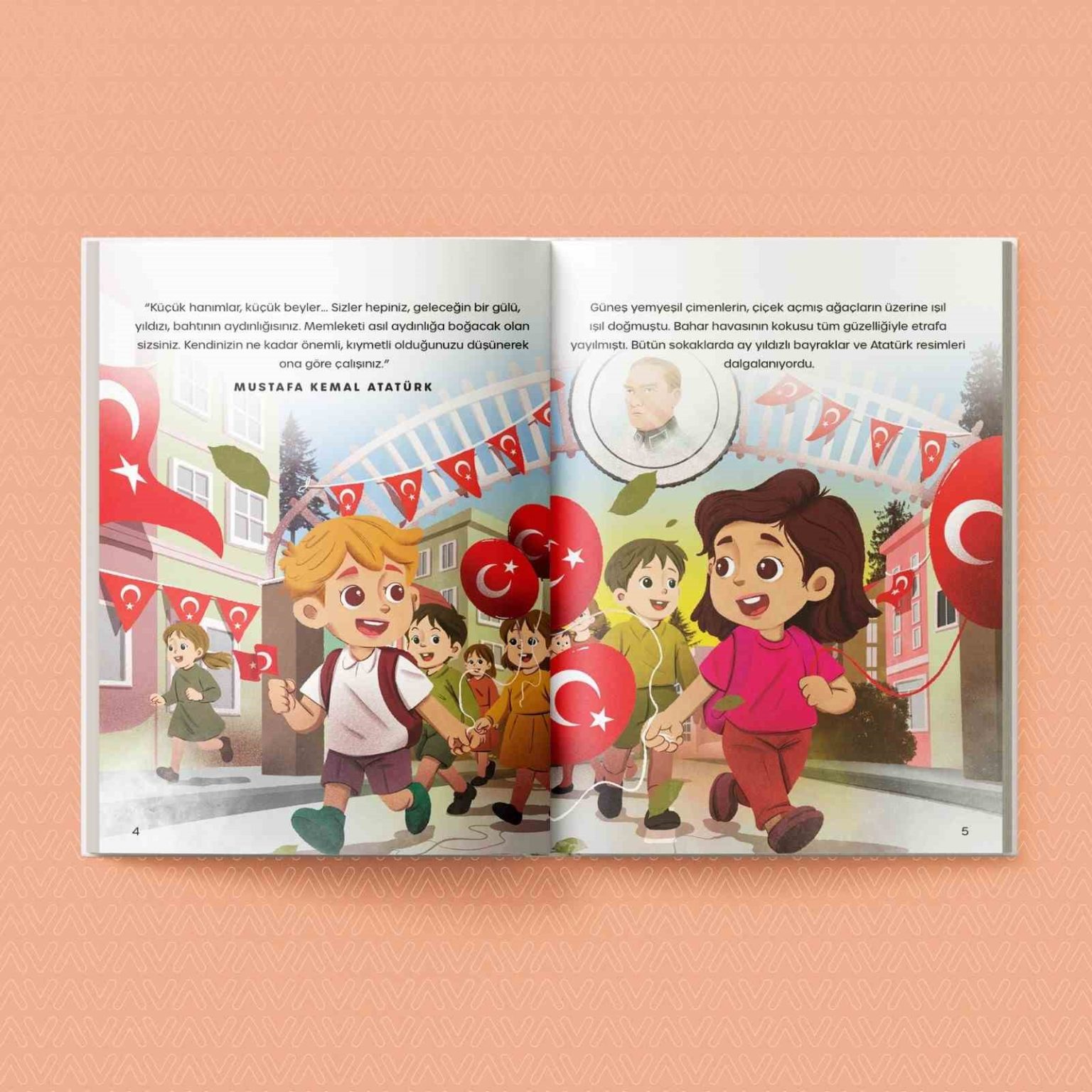 Kitapta Ali ve Ece’nin bayram sabahı başlayan hikâyesi, okul yolculuğu, Atatürk İlkokulu’ndaki tören hazırlıkları, şiir okumaları, resim yarışmaları ve halk oyunları gösterileriyle devam ediyor. 23 Nisan’ın, milli egemenliğin, Cumhuriyet bilincinin ve çocuklara duyulan güvenin de simgesi olan bir bayram olduğu vurgulanıyor.