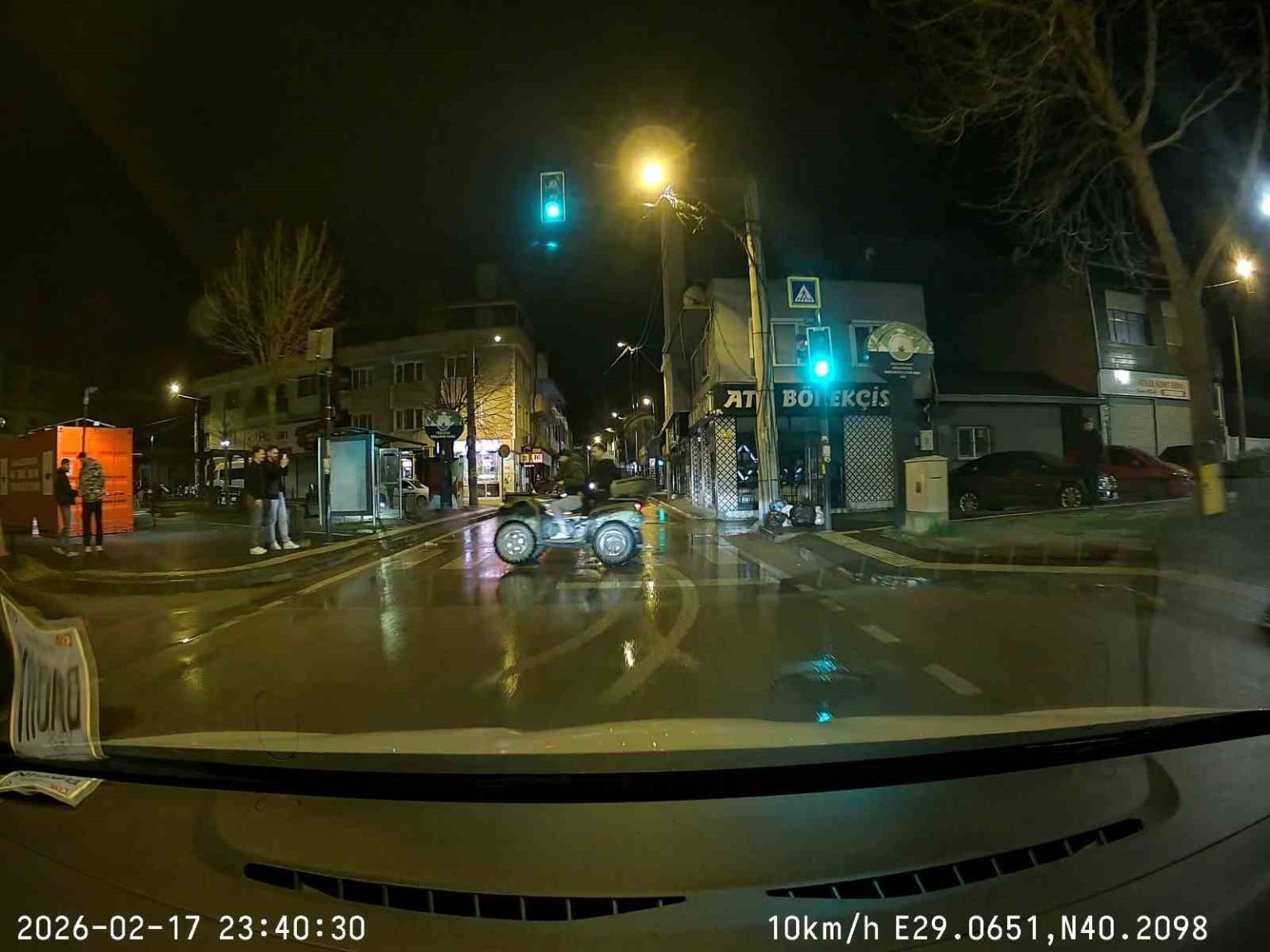 Bursa’nın Osmangazi ilçesinde ATV üzerinde drift atan iki arkadaşın trafiği tehlikeye düşürdüğü anlar kameraya yansıdı. Kontrolden çıkan ATV’nin kaldırıma çarpması sonucu iki arkadaş kazayı kıl payı atlattı.