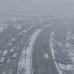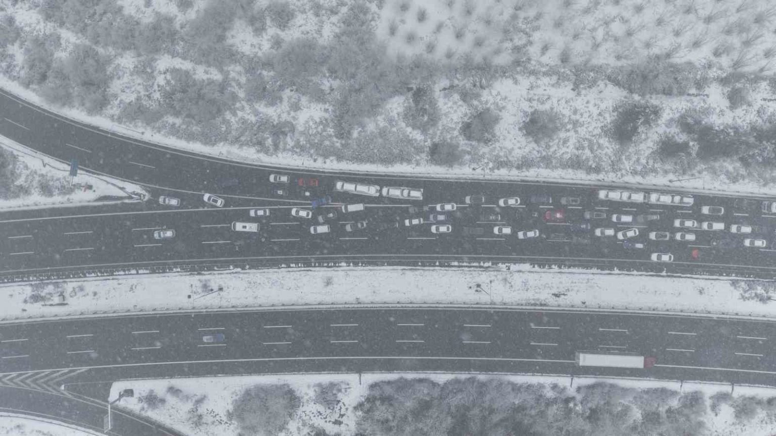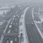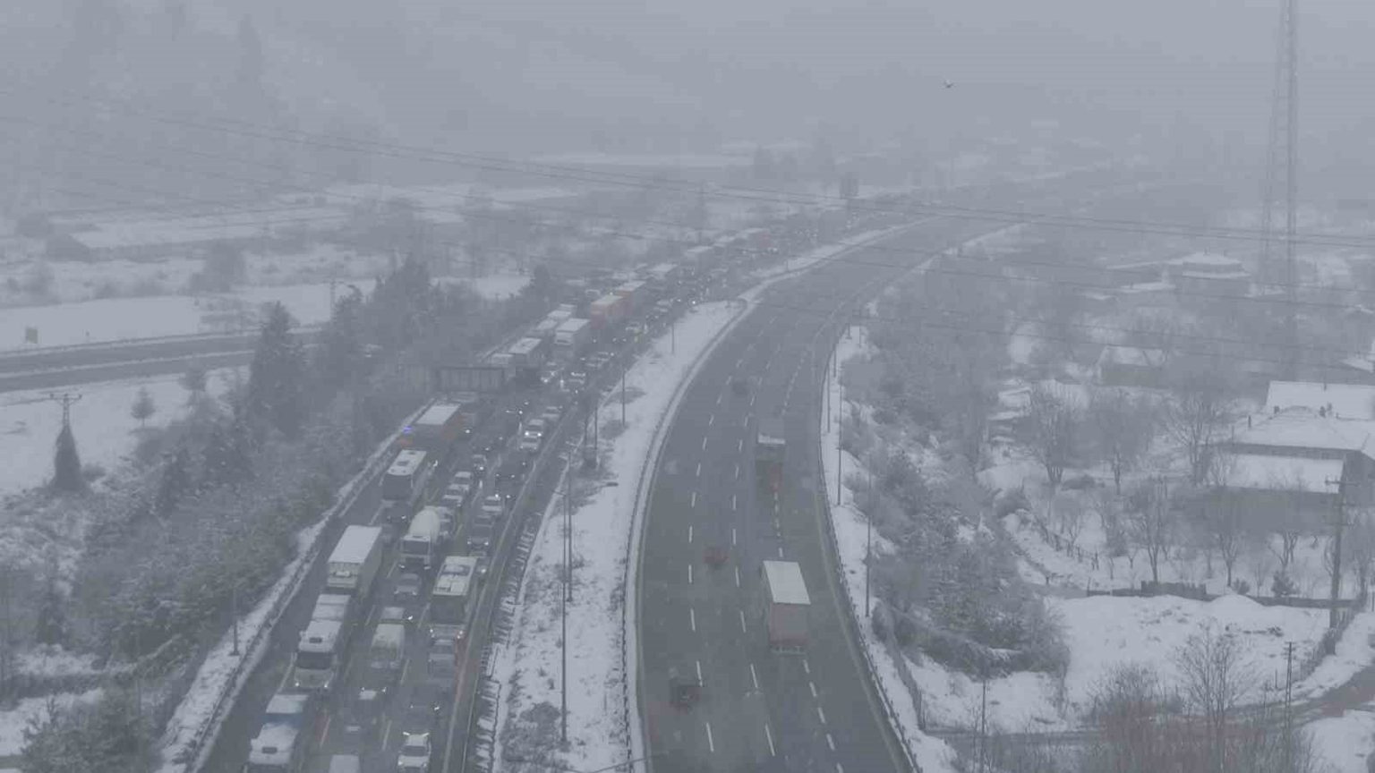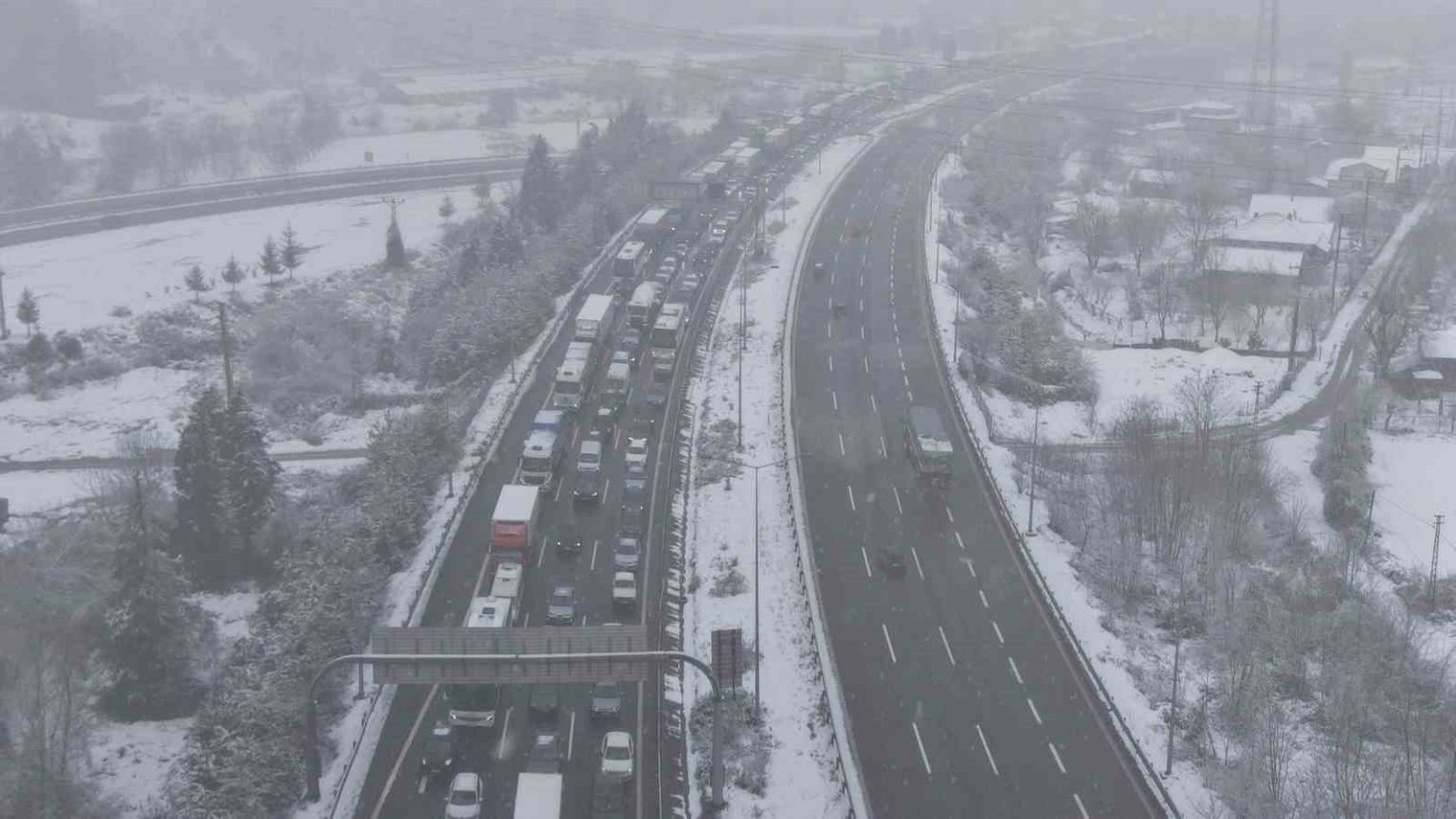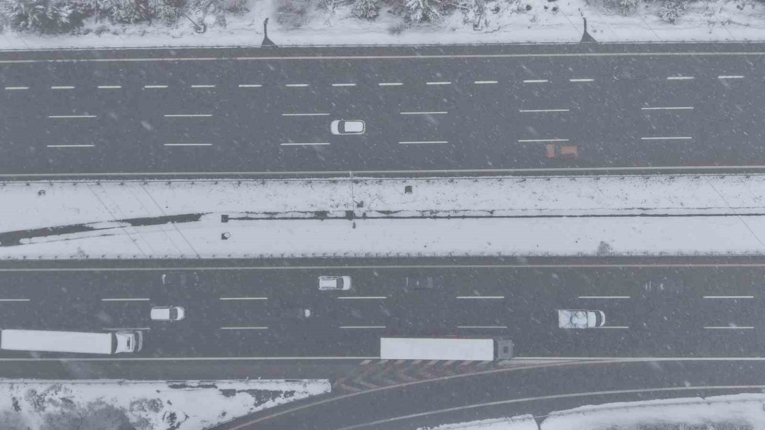 Düzce’de etkili olan kar yağışı sebebi ile aralıklarla Anadolu Otoyolu Bolu Dağı geçişinde kısmi trafiğe kapanırken, o anlar dron ile görüntülendi.