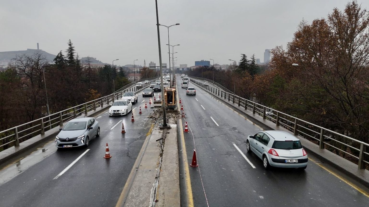 Ankara’nın Keçiören ilçesindeki köprü çalışmasında tek bir işçinin çalışması, iş çıkış saatlerinde uzun araç kuyruklarına sebep oluyor.