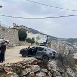 Antalya’da geri manevra yapan araç şarampolde asılı kaldı