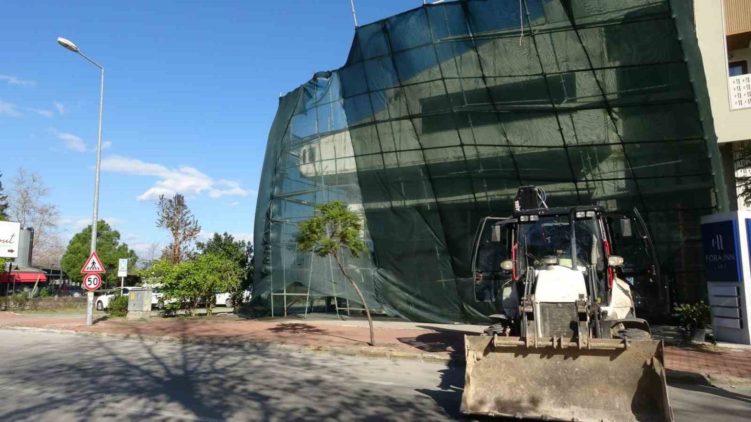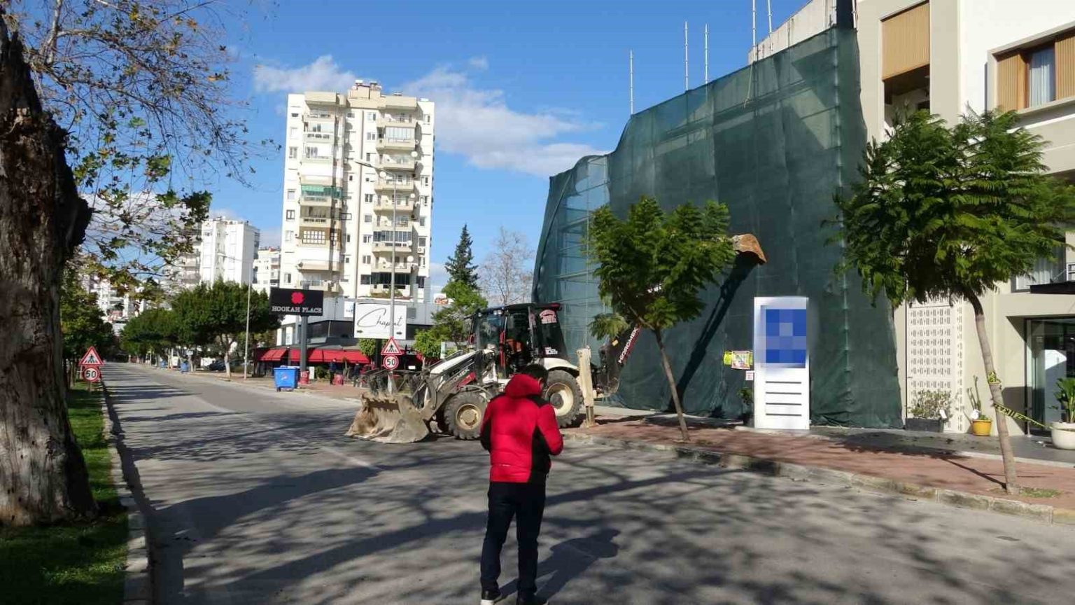 Antalya’da saatteki hızı 62 kilometreyi bulan fırtınaya dayanamayan inşaat iskelesi yerinden söküldü. Yol araç trafiğine kapatılırken, iskele iş makinesi yardımıyla yeniden sabitlendi.