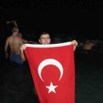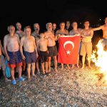 Hava sıcaklığının 9 derece, deniz suyu sıcaklığının ise 20 derece olarak ölçüldüğü Antalya’da, deniz tutkunları suyun sıcaklığından memnun olduklarını ifade etti. Denize girmeden önce sahilde yaktıkları ateşin etrafında toplanan grup, Türk bayrağı eşliğinde denize girdi.