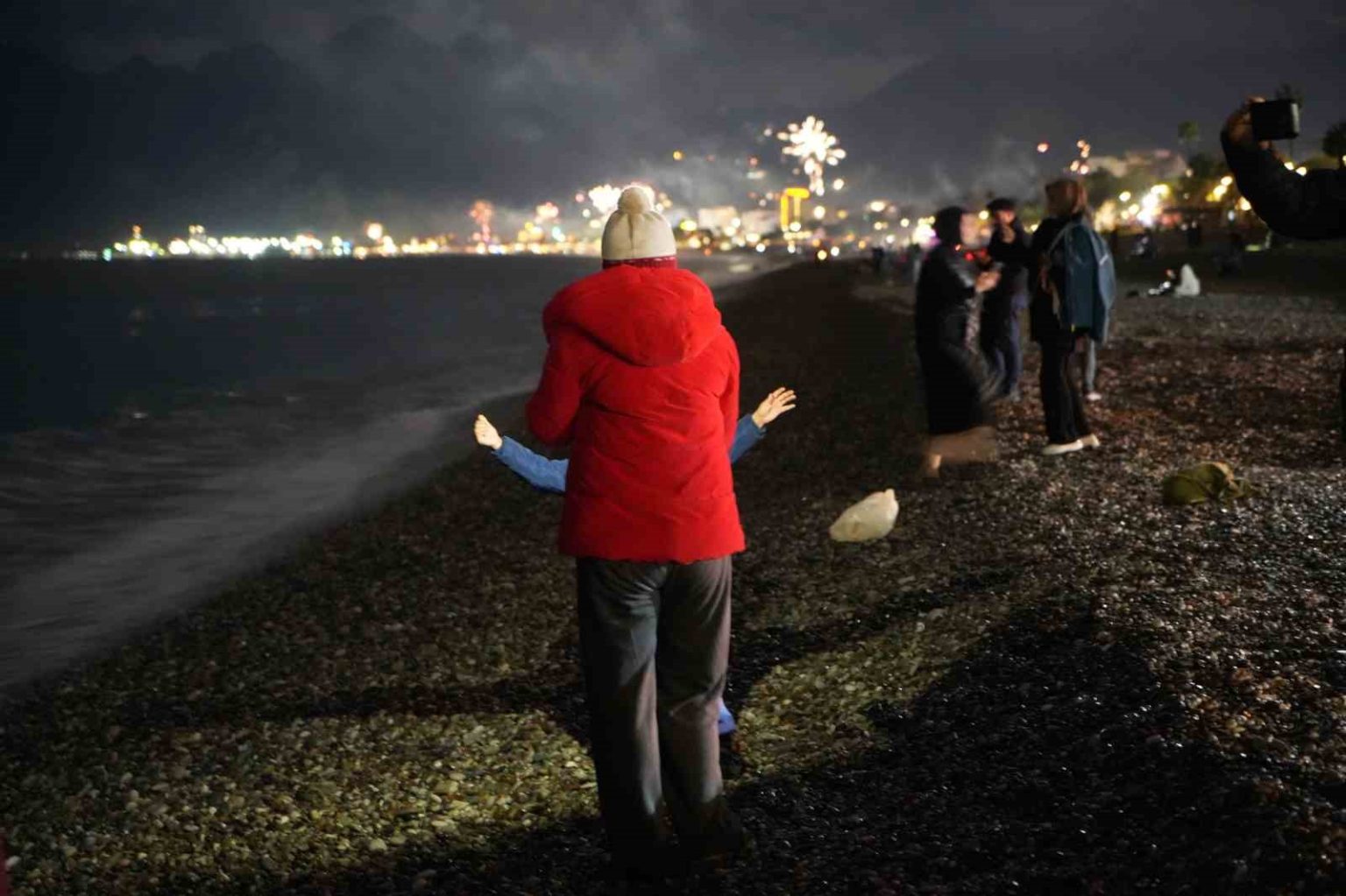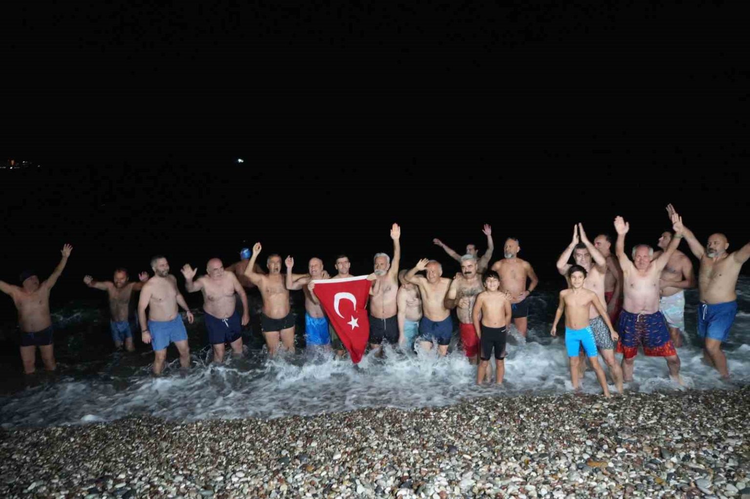 Gece saatlerinde Konyaaltı Sahili’nde bir araya gelen yaklaşık 30 kişilik grup, ellerinde Türk bayraklarıyla geri sayım yaparak yeni yılı denizde karşıladı. Saatler 00.00’ı gösterdiğinde ise grup üyeleri hep birlikte denize girerek 2026 yılının ilk dakikalarını Akdeniz’in serin sularında geçirdi.