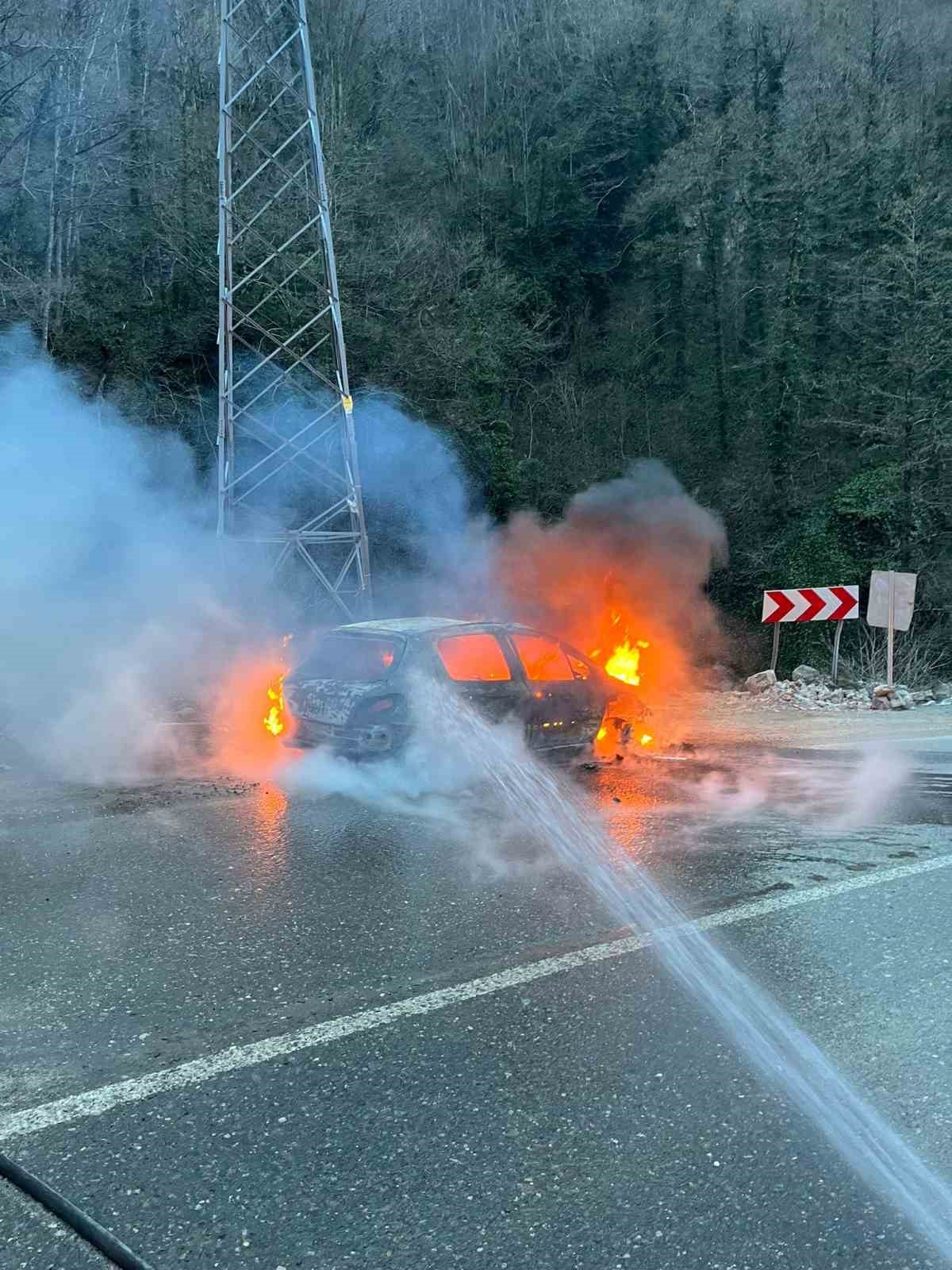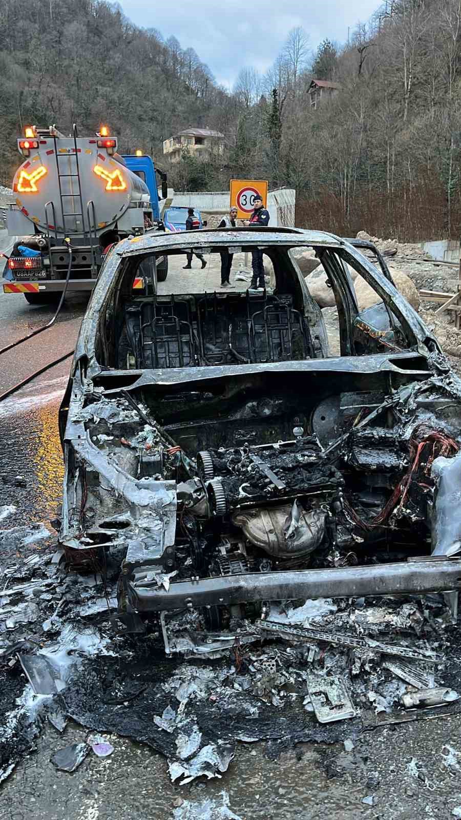 Artvin’de Borçka-Hopa karayolunda Cankurtaran Tüneli mevkisinde seyir halindeyken alevlere teslim olan bir araç, kısa sürede büyüyen yangının ardından tamamen kullanılamaz hale geldi.