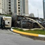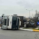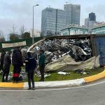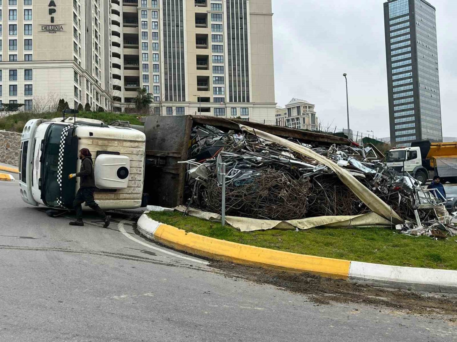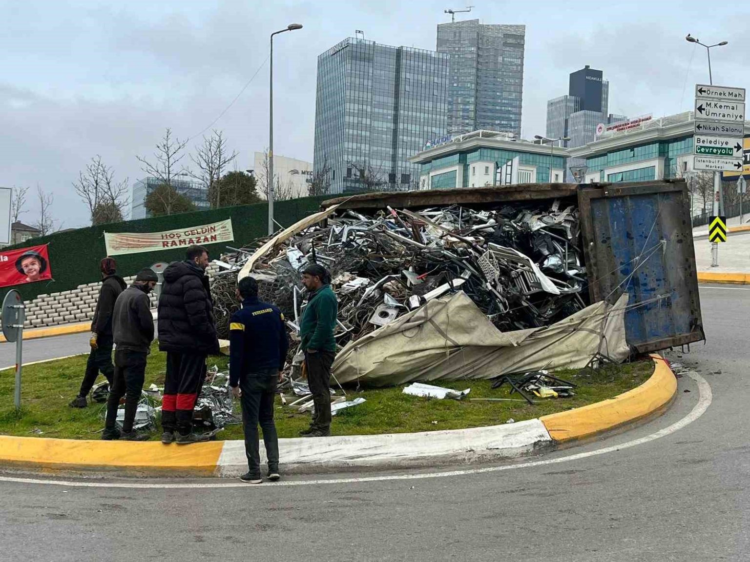Ataşehir’de hurda yüklü kamyon sürücüsünün direksiyon hakimiyetini kaybetmesi sonucu devrilerek yan yattı.