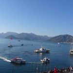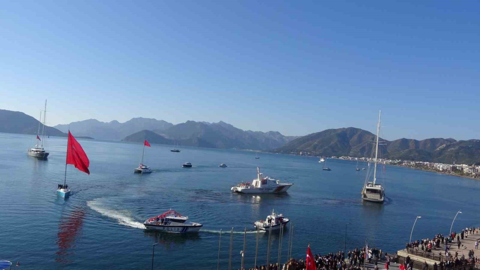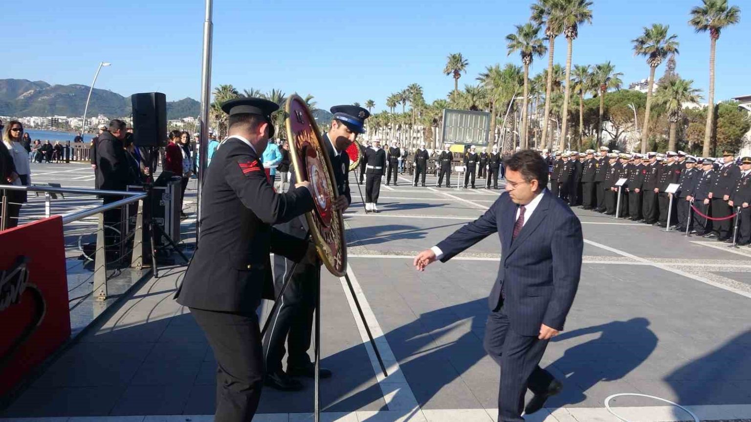 Marmaris Atatürk meydanında sabah saat 09.50 de başlayan Tören, Marmaris Kaymakamlığı, Aksaz Deniz Üs Komutanlığı ve Belediyenin Atatürk büstüne çelenk sunumuyla başladı. Aksaz Deniz Üs Komutanlığı Askeri Bandosu eşliğinde yapılan saygı duruşunun ardından İstiklal Marşı okundu. Günün anlam ve önemini belirten konuşmanın ardından, Atatürk Meydanı önündeki denizde Türk Bayrağı ve Atatürk posterleriyle donatılmış yelkenli tekneler ile Sahil Güvenlik botları siren çalarak geçiş yaptı. Bu sırada Mustafa Kemal Atatürk’ün Marmaris’e gelişini temsilen canlandırma gerçekleştirildi. Teknelerin geçişi esnasında, Dalaman 166. Jet Filo Komutanlığı’na bağlı muharip uçaklar da saygı uçuşu yaptı.