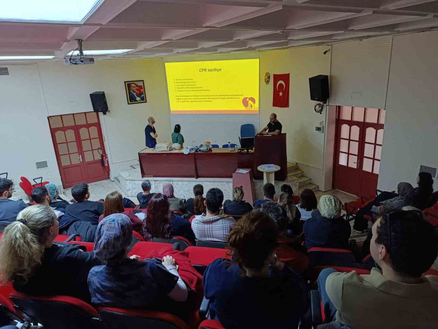 Aydın Devlet Hastanesi konferans salonunda iki gün süren CPR, triyaj ve afet yönetimi eğitimleri kapsamında sağlık personeli, acil durumlara müdahale ve kriz yönetimi konusunda bilgi ve becerilerini güncelledi.