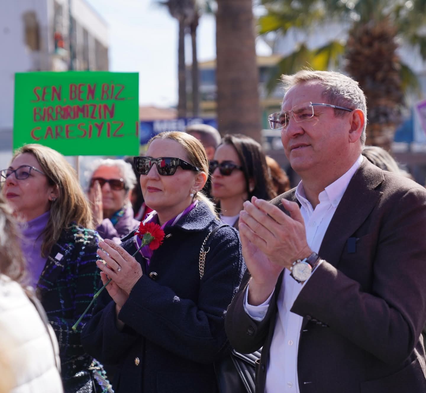Yürüyüşe katılan vatandaşları, eşi Canan Ergin ile birlikte Cumhuriyet Meydanı’nda karşılayan Başkan Mesut Ergin, kadınların eşitlik mücadelesine destek vermeye devam edeceklerini belirtti.