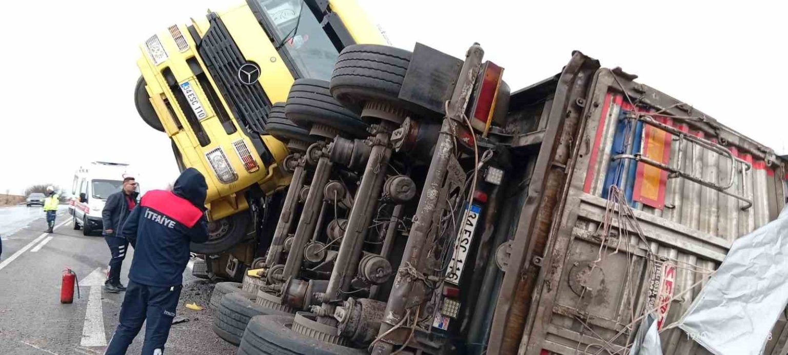 Afyonkarahisar’da yağışlı hava nedeniyle kontrolden çıkarak devrilen balık yemi yüklü tırın sürücüsü yaralandı.