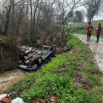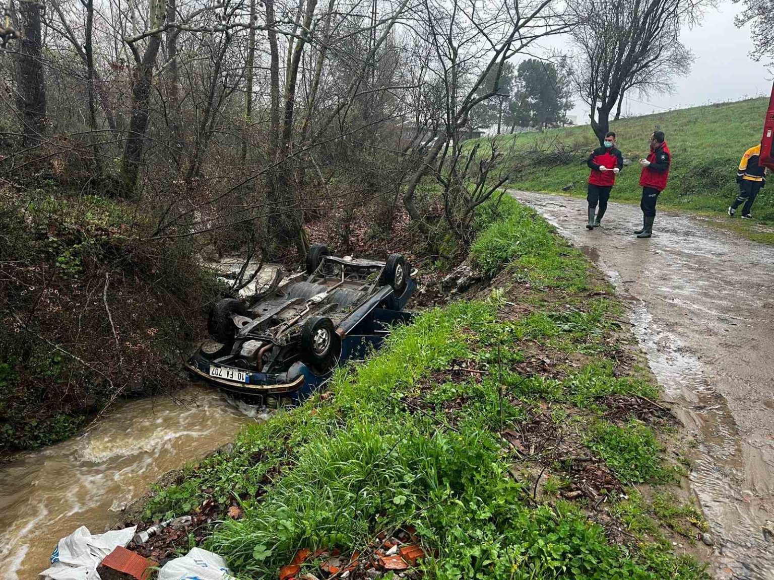Balıkesir’in Sındırgı ilçesinde dere içerisinde ters dönmüş otomobil ve 50 metre ilerisinde bir erkek cesedi bulundu.