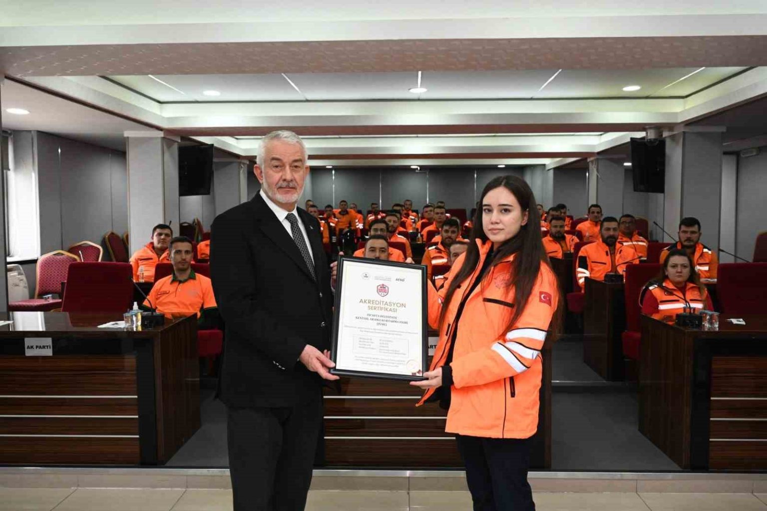 Konuşmaların sonunda ISAK ekibi INSARAG standartlarında aldığı ‘Kentsel Arama ve Kurtarma Orta Ekip Akreditasyon Belgesi’ni Belediye Başkanı Şükrü Başdeğirmen’e takdim etti. Ekip ayrıca Başkan Başdeğirmen’e Kahramanmaraş’ta 12 Şubat Mahallesi’ndeki 10 dairelik Erciyes Apartmanı’ndan 72 saat sonra kurtardıkları Gülten hanımın hatıra olarak verdiği duvar saatini takdim etti.