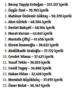 01-28 Şubat 2026 tarihleri arasında 10 bini aşkın internet haber sitesi, televizyon kanalı, yazılı basın yayını ve sosyal medya platformunun analiz edildiği raporda Cumhurbaşkanı Recep Tayyip Erdoğan listenin ilk sırasında yer aldı.
