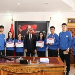 Oltu Belediye Başkanı Adem Çelebi, bölge birincisi olan Oltu ilçesi Yusuf Ziya Bey Anadolu Lisesi Genç A Floor Curling takımını makamında kabul etti.