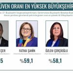 Yerel Yönetimler Güven Endeksi Mart 2026 araştırmasının sonuçları açıklandı. 27 Şubat-14 Mart 2026 tarihleri arasında Türkiye genelinde 27 büyükşehirde gerçekleştirilen araştırmada, vatandaşlara “Büyükşehir Belediye Başkanınıza ne derece güveniyorsunuz?” sorusu yöneltildi. Araştırma sonuçlarına göre Aydın Büyükşehir Belediye Başkanı Özlem Çerçioğlu, yüzde 58,1’lik güven oranıyla Türkiye genelinde üçüncü sırada yer aldı. Listenin ilk sırasında yüzde 60,5 ile Mersin Büyükşehir Belediye Başkanı Vahap Seçer yer alırken, ikinci sırada yüzde 59,1 ile Gaziantep Büyükşehir Belediye Başkanı Fatma Şahin bulundu. Aydın Büyükşehir Belediye Başkanı Özlem Çerçioğlu ise üçüncü olarak, Türkiye’nin en güvenilen üçüncü belediye başkanı oldu.
