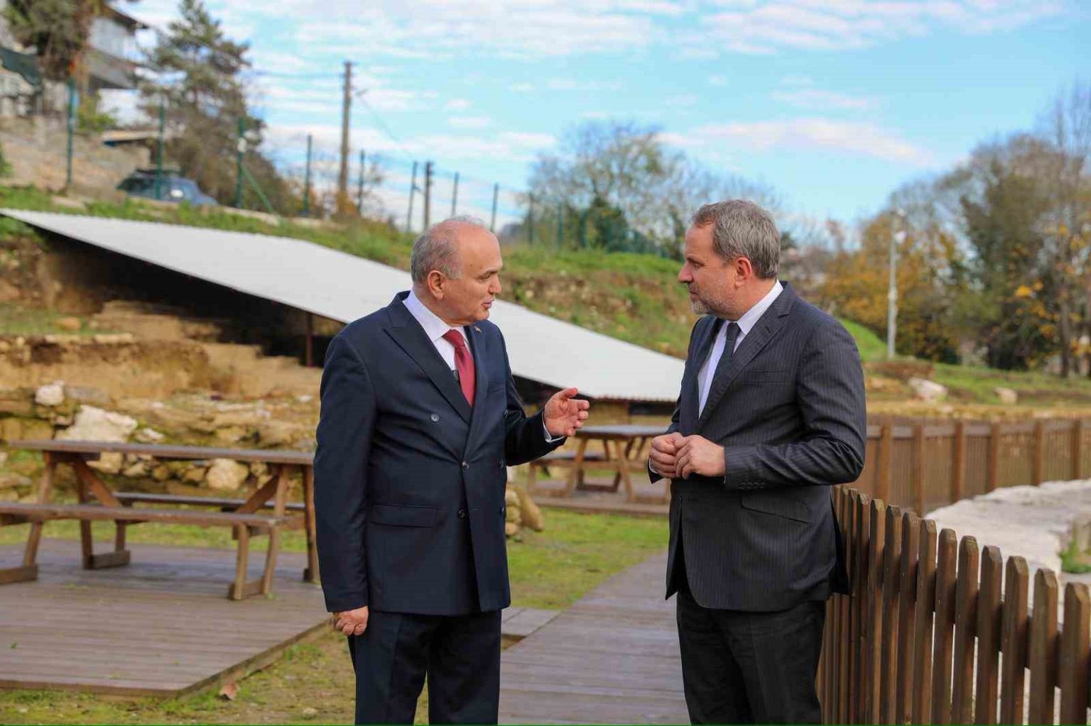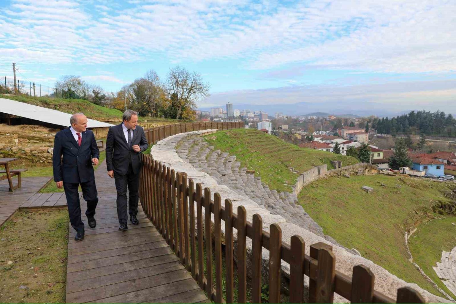 Düzce Üniversitesi’nde düzenlenen konferansa konuşmacı olarak katılan ve fahri doktora belgesi takdim edilen Savunma Sanayii İmalatçıları Derneği (SASAD) Başkanı Osman Okyay, Düzce Belediye Başkanı Dr. Faruk Özlü ile birlikte Konuralp Antik Tiyatro’yu gezdi.