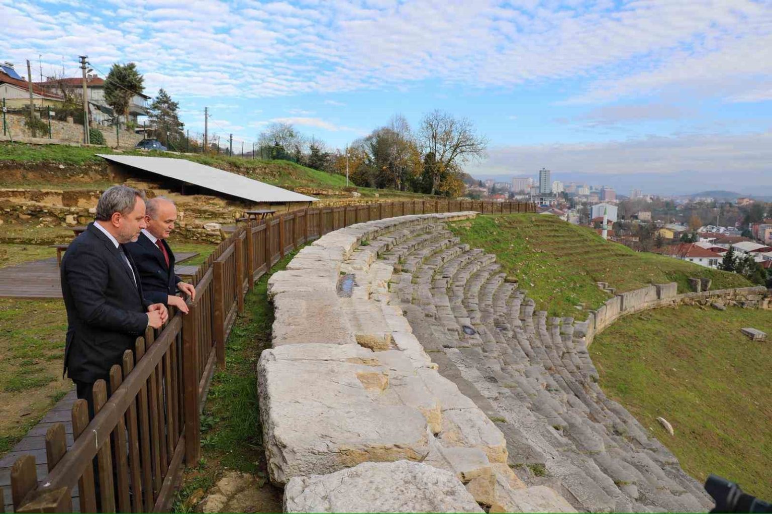Düzce Belediyesi’nin personel ve lojistik desteği sayesinde kısa sürede gün yüzüne çıkarılan Konuralp Antik Tiyatro ziyaretçilerinde hayranlık uyandırmaya devam ediyor. Başkan Faruk Özlü’nün davetlisi olarak şehirde bir dizi programa katılan ve daha sonra Konuralp Antik Tiyatro alanını ziyaret eden Osman Okyay, tarihi yapı hakkında bilgi aldı. İstanbul ve Ankara’ya en yakın antik tiyatro olma özelliği taşıyan Konuralp Antik Tiyatro hakkında bilgiler paylaşan Başkan Özlü, Konuralp’i bir destinasyon merkezi haline getirmek için üç aşamalı çalışma planı hazırladıklarını aktardı.