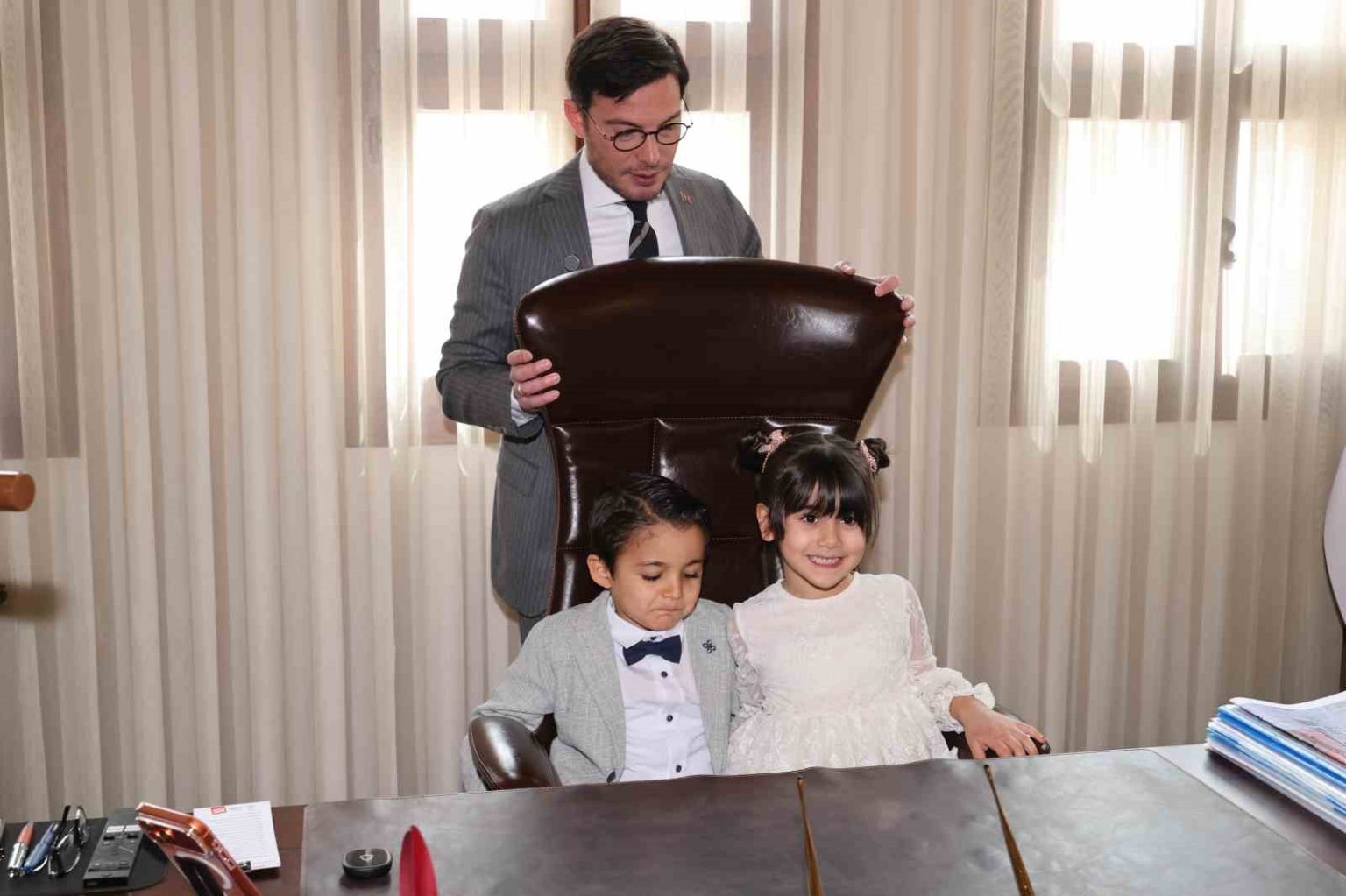 Tokat Belediye Başkanı Mehmet Kemal Yazıcıoğlu, 23 Nisan kapsamında ağırladığı anaokulu öğrencilerini temsili olarak başkanlık koltuğuna oturtarak çocukların hayallerini dinledi ve bayram coşkusunu makamında paylaştı.