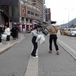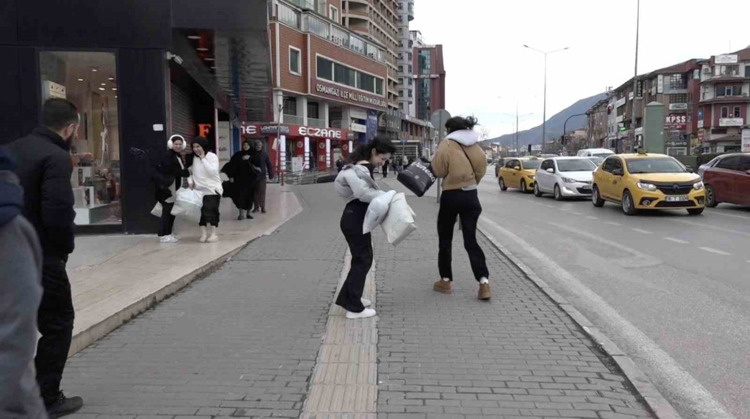 Şiddetli rüzgâr nedeniyle yürümekte güçlük çeken bir başka vatandaş ise ayakta kalabilmek için yaya yolundaki bir direğe tutundu. Lodos, kent merkezinde günlük yaşamı olumsuz etkiledi.
