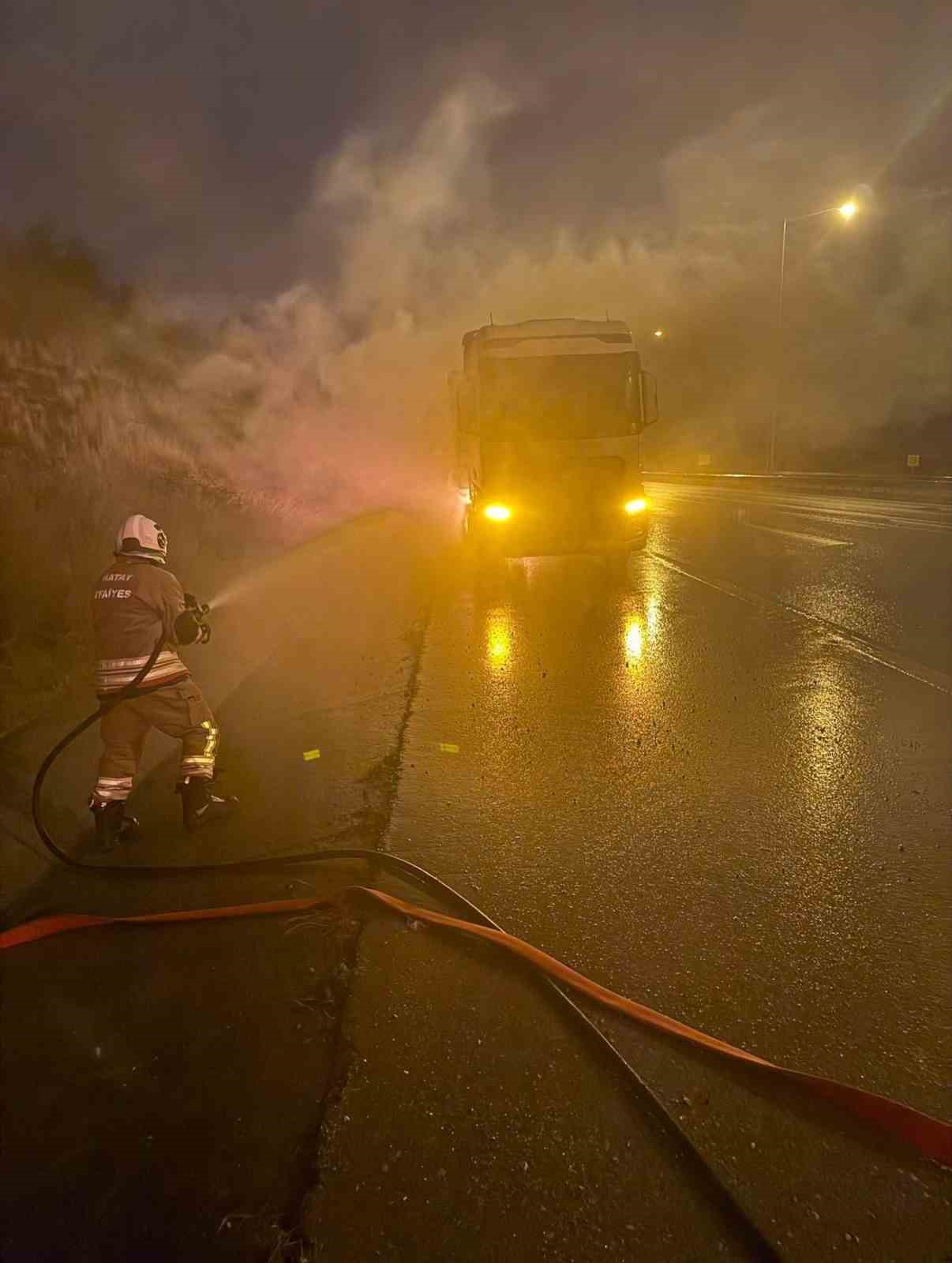 Hatay’da seyir halindeyken balata kısmında yangın çıkan tırdan alevler yükseldi.