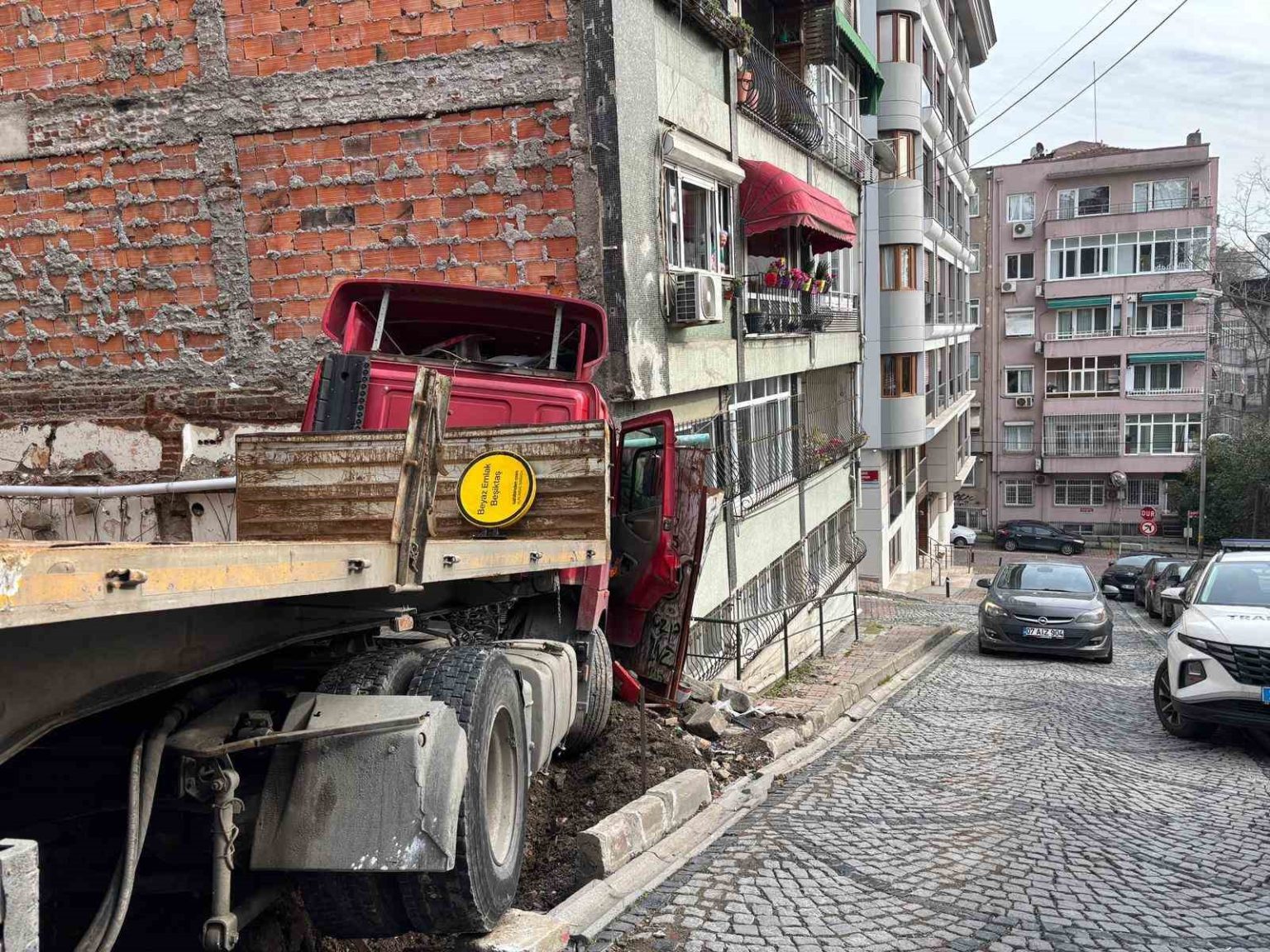 Kaza, saat 11.40 sıralarında Beşiktaş ilçesi Cihannüma Mahallesi Çömezler Sokak’ta meydana geldi. İddiaya göre, sokakta bulunan inşaat alanına bir tırla demir getirildi. Demirler tırdan indirildikten sonra tır şoförü M.G. (45) yokuş aşağı vaziyette tırı park edip araçtan inerek, çıkış için sokakta kendine yol aramaya başladı. Park halinde bulunan tır, freni boşalınca yokuş aşağı kaymaya başladı. Araç, sokaktaki 5 katlı bir binanın yan duvarına çarparak durabildi. İhbar üzerine olay yerine polis ekipleri sevk edildi. Olayda ölen ya da yaralanan olmazken, bir emlakçı dükkanında, tırın çarptığı binada ve tırda hasar meydana geldi. Olay esnasında sokakta kimsenin olmaması sayesinde faciadan dönülürken, bina sakinleri büyük korku yaşadı.