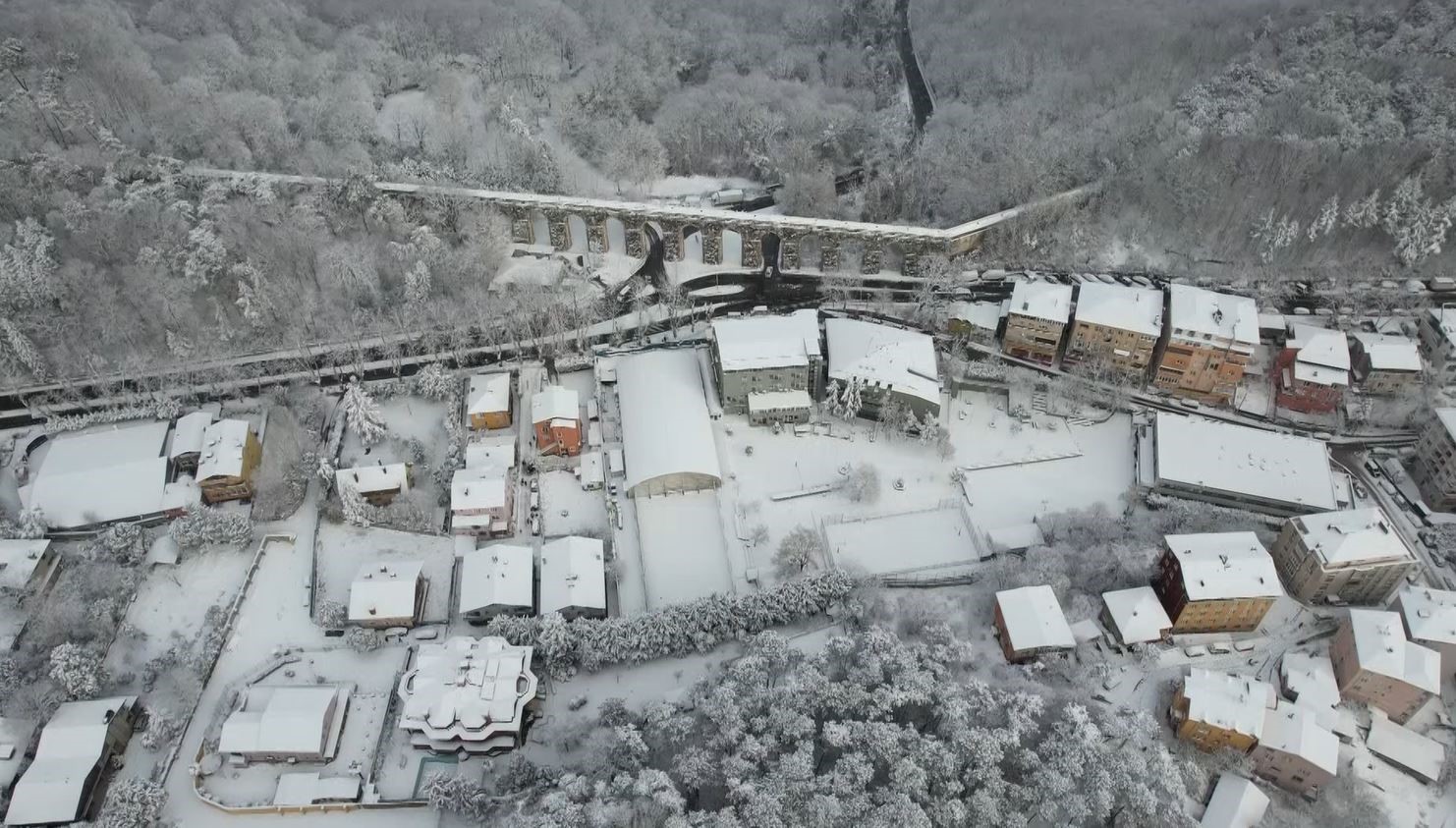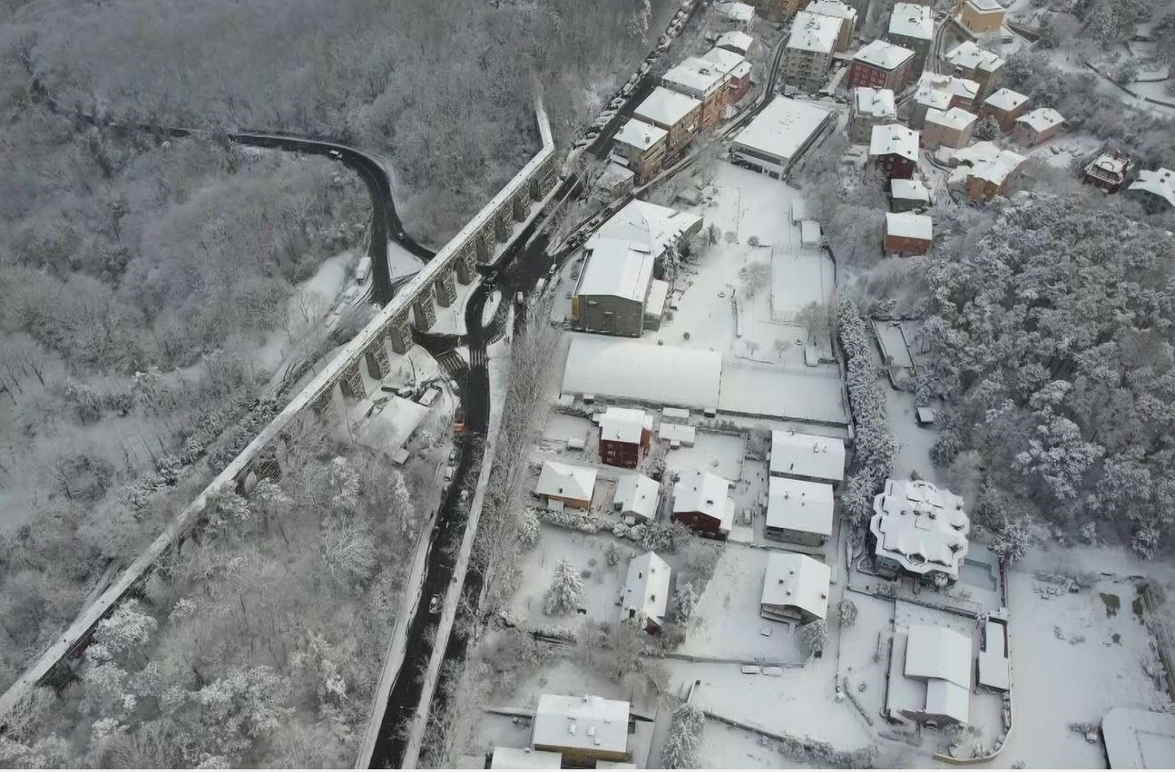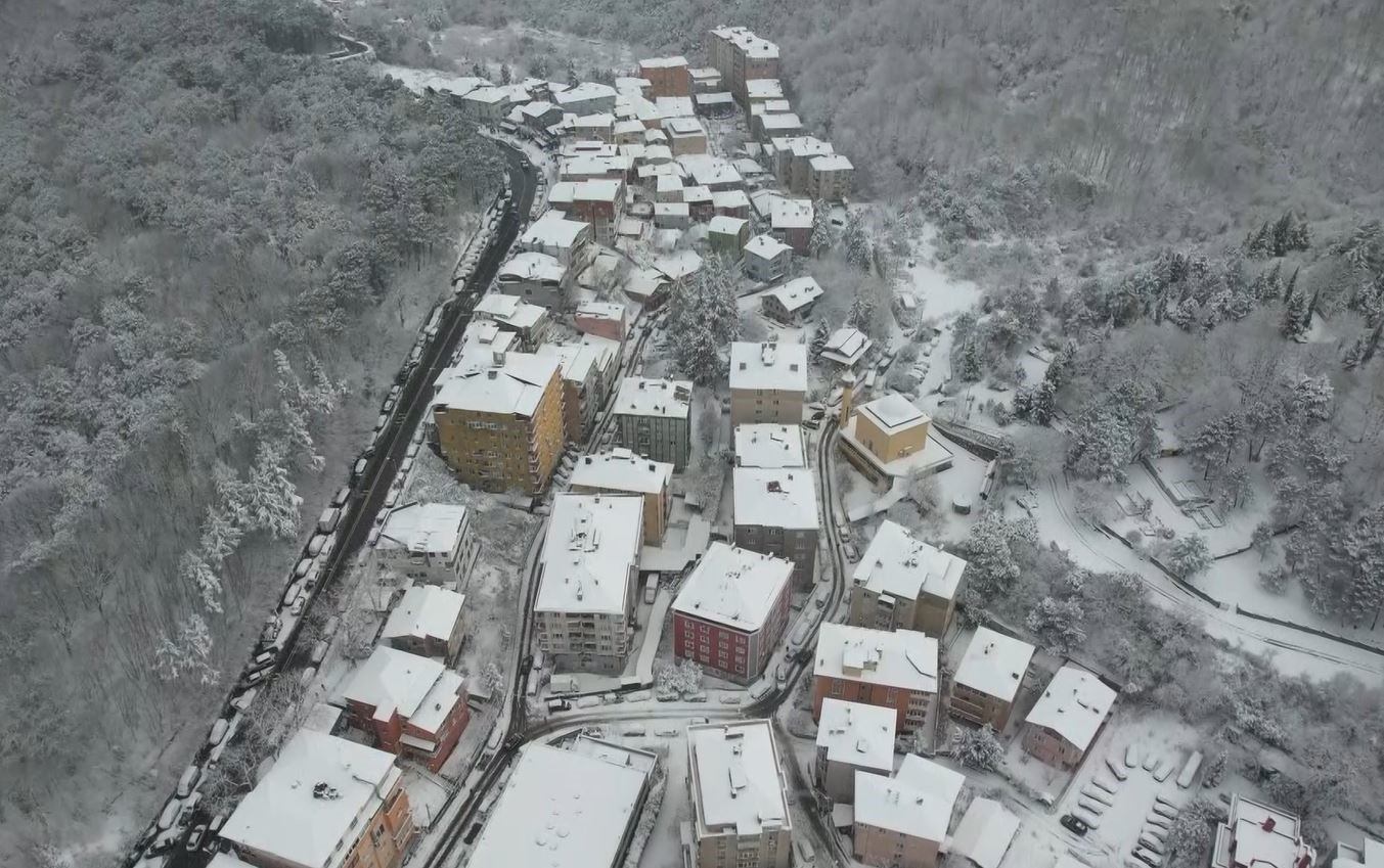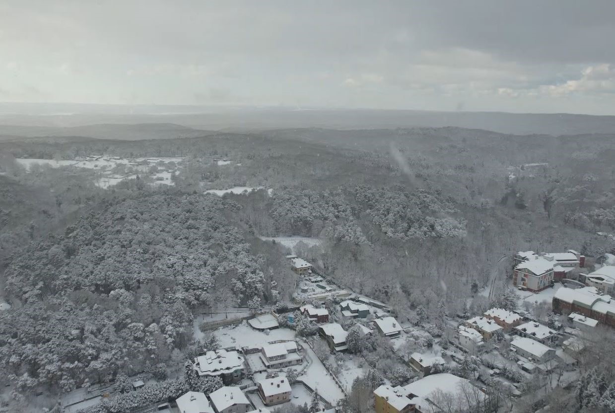 İstanbul Sarıyer’de etkili olan kar yağışı her yeri beyaz örtü ile kapladı. Kartpostallık manzara havadan görüntülendi.