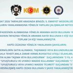 Bingöl İl Emniyet Müdürlüğü tarafından 6–13 Şubat 2026 tarihleri arasında il genelinde yürütülen aranan şahısların yakalanmasına yönelik yürütülen çalışmalar kapsamında önemli sonuçlar elde edildi. Bu kapsamda, ifadesinin alınmasına yönelik aranma kaydı bulunan 19 kişi ile hapis cezasının infazına yönelik aranma kaydı bulunan 5 kişi olmak üzere toplam 24 kişi yakalanarak adli işlemlere başlandı. Öte yandan aynı tarihlerde Terörle Mücadele, Narkotik Suçlarla Mücadele ve Asayiş Şube Müdürlükleri tarafından yürütülen çalışmalar kapsamında ise çeşitli suçlardan 23 şüpheli şahıs yakalandı. Yakalanan şüphelilerden 18’i serbest bırakılırken, 3 şüpheli şahıs adli kontrol şartıyla serbest bırakıldı.