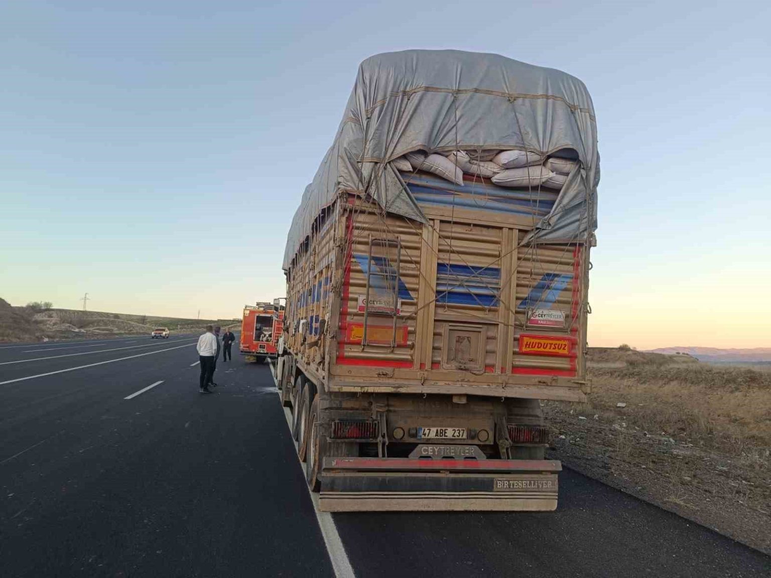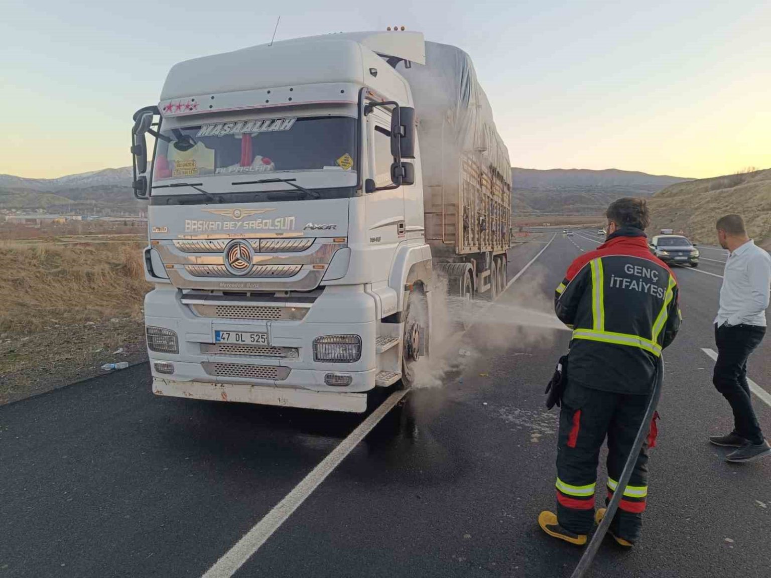 Olay, Genç ilçesi çıkışında meydana geldi. Edinilen bilgilere göre, 47 DL 525 plakalı tırın balatalarının tutuşması sonucu araçta yangın çıktı. Alevleri fark eden sürücünün durumu bildirmesi üzerine bölgeye itfaiye ekipleri sevk edildi.