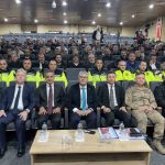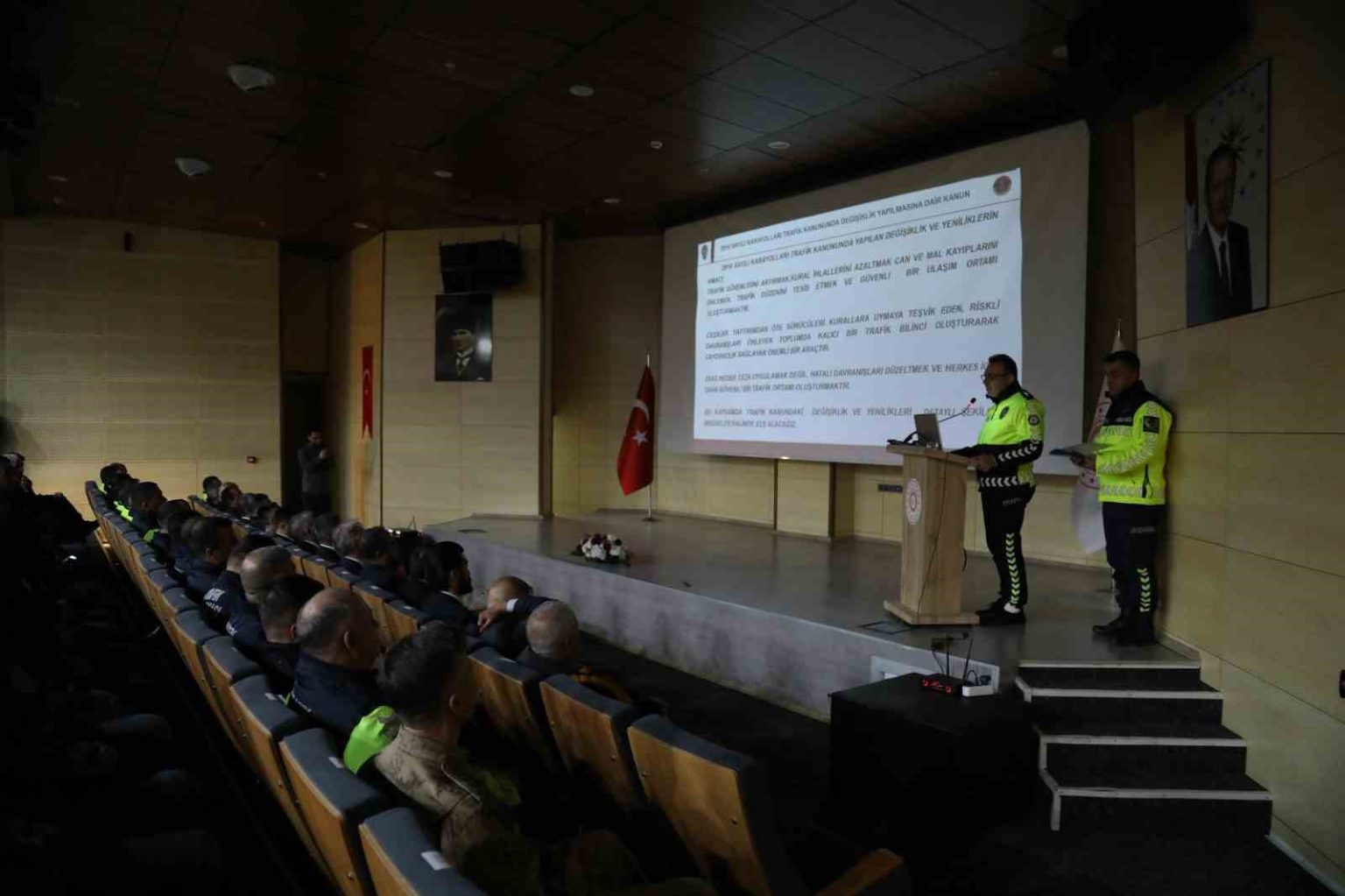 Toplantıda daha sonra İl Emniyet Müdürlüğü ve İl Jandarma Komutanlığı personeli tarafından yeni trafik kuralları ve cezai yaptırımlara ilişkin sunum yapıldı.
