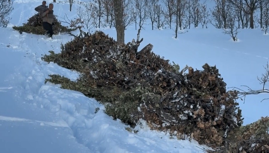 Bitlis’te yazın dağlık alanlarda toplanan yapraklı meşe dalları, kışın karlı yamaçlardan kızaklarla indirilerek hayvanlara veriliyor.