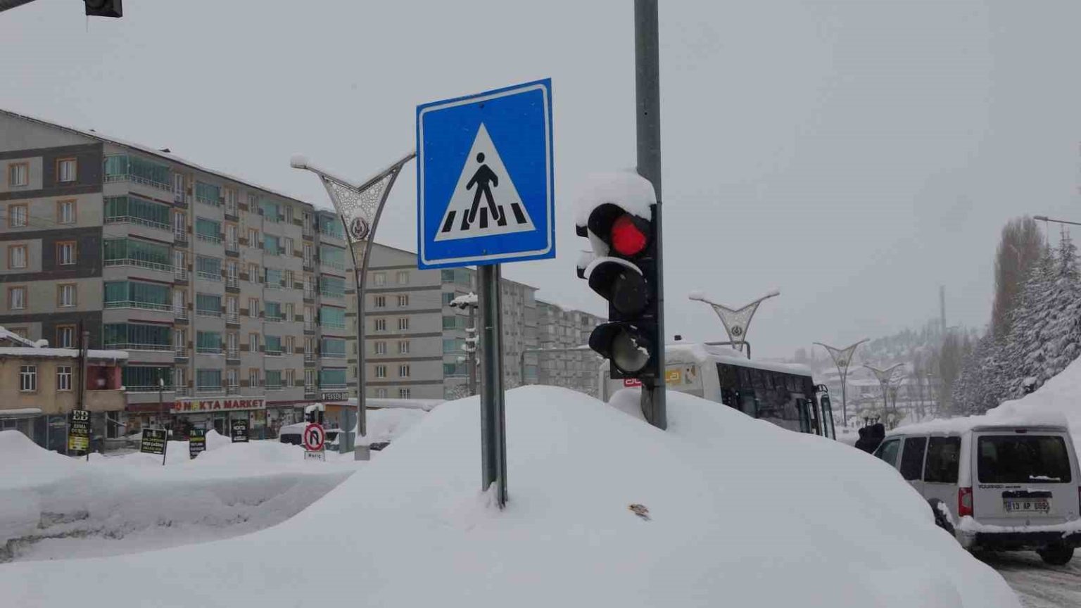 Kar yağışı nedeniyle merkeze bağlı Hüsrevpaşa Mahallesi’nde bulunan tek katlı evler kardan kaybolurken, yine aynı şekilde araçlar ve tabelalar da kar altında kaldı.
