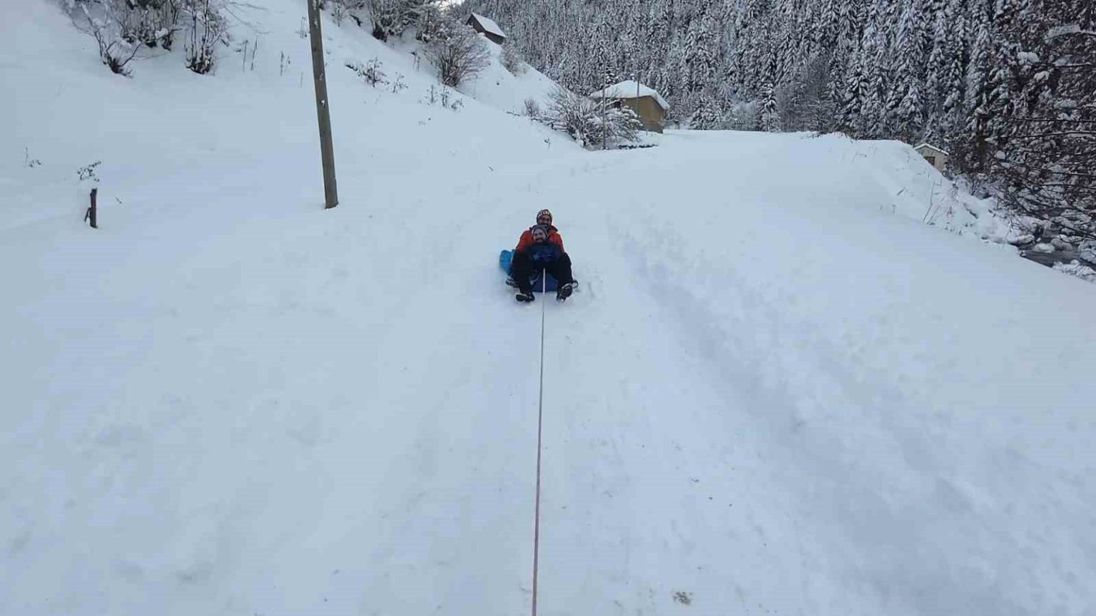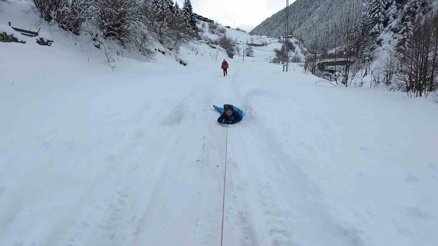 Rize’de yağan karı fırsat bilen 2 kafadarın cipin arkasına bağladıkları branda ile yol boyunca kaydıkları anlar, renkli görüntülere sahne oldu.