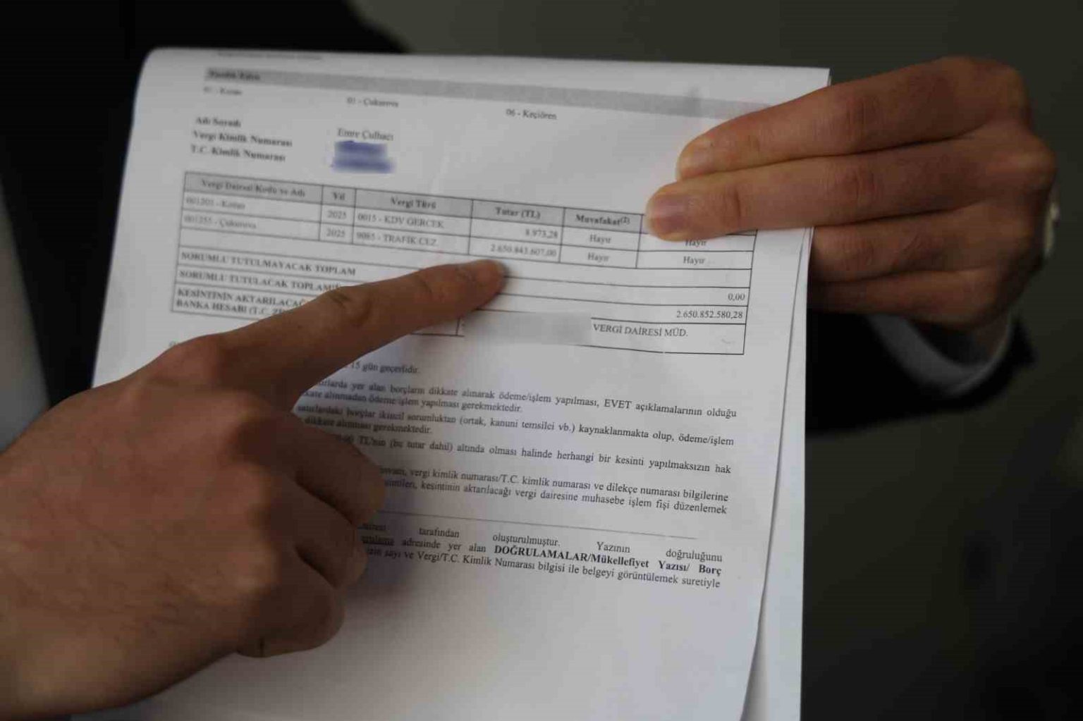 İlk etapta rakamın yanlış okunduğunu düşündüğünü belirten Çulhacı, “İnanılmaz bir rakamdan bahsediliyordu. Bir hane eksik okunarak bana söylenen ve bu bile çok yüksek bir miktardı. Önce yaklaşık 2 milyon TL civarında bir borç olduğu söylendi. Buna bile inanamadım. Ancak daha sonra 2 milyar 650 milyon TL gibi astronomik bir rakamla karşılaştım. E-Devlet üzerinden Dijital Vergi Dairesi’nden borç durum yazısı aldım. Süreci düzeltmek için çalışmalara başladım. Gerçekten de bu rakam sistemde görünüyordu. Ancak vadesi geçmiş borçlara baktığımda durumun farklı olduğunu fark ettim. Dolar bazında güncel borca baktığımda 63,5 milyon dolar borç oluyor. Ödenmemiş hatalı bir “u” dönüşü 1042 TL cezam vardı ” diye konuştu.