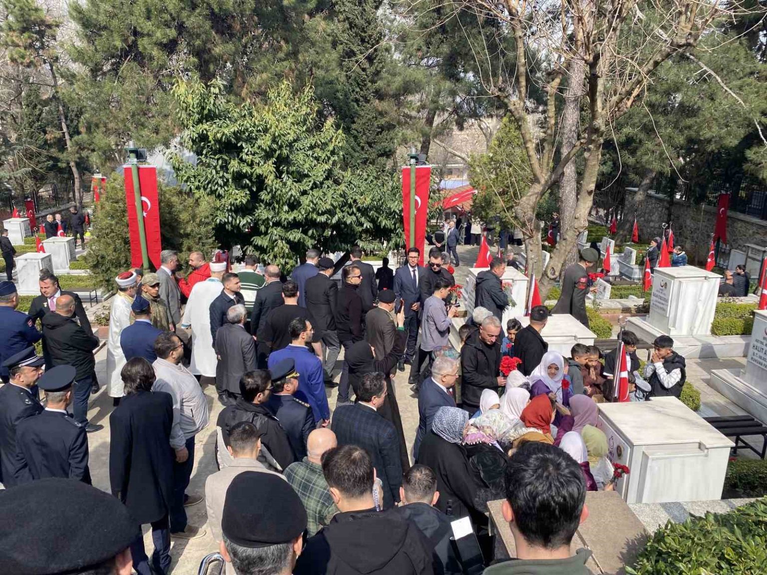 Bursa’da 18 Mart Şehitleri Anma Günü ve Çanakkale Zaferi’nin yıl dönümü dolayısıyla gerçekleştirilen törenlerin ardından kent protokolü Pınarbaşı Şehitliği’nde bir araya geldi. Program kapsamında şehit mezarlarına karanfiller bırakılırken, dualar edilerek Şehitlik Defteri imzalandı.