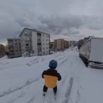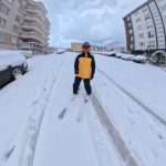 Bursa’nın Mudanya ilçesinde etkili olan yoğun kar yağışının ardından yolların karla kaplanması ilginç görüntülere sahne oldu. İlçede bir vatandaş sabah saatlerinde işe gitmek için kayak malzemelerini alarak karla kaplı sokaklarda kayak yaparak ilerledi.