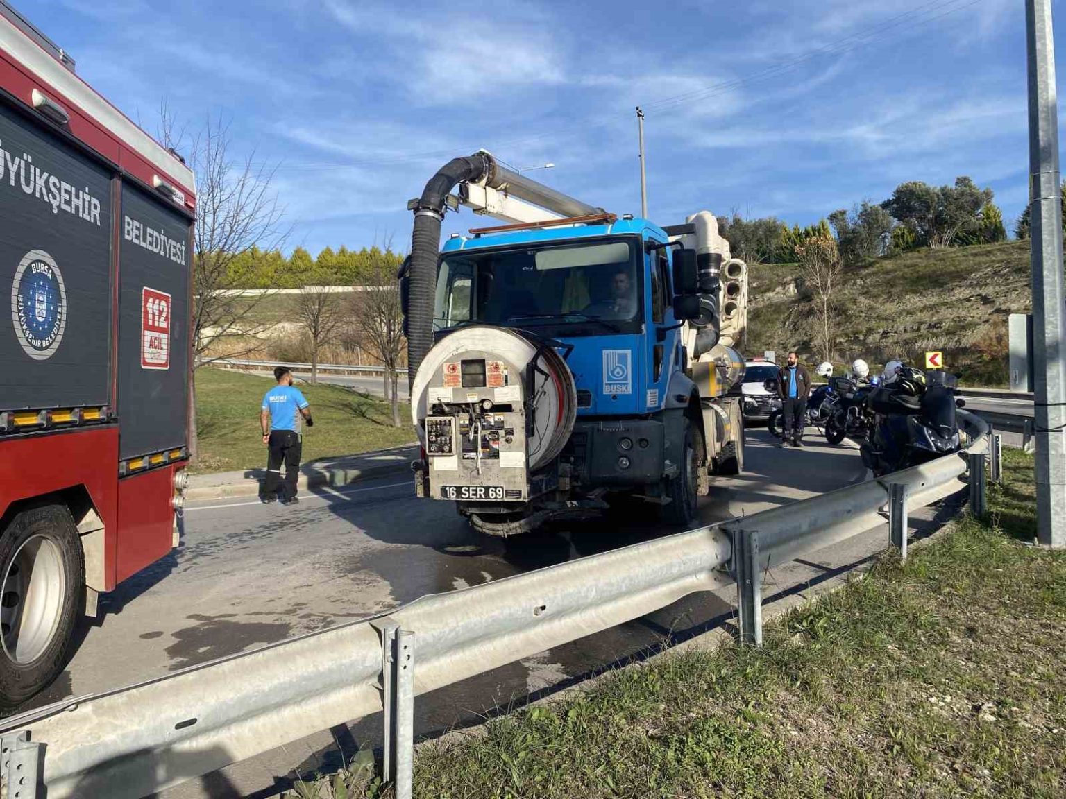 O sırada yoldan geçen BUSKİ’ye ait bir vidanjör durup sürücüye yardım etti. İtfaiye ekipleri gelene kadar yanan araca su sıkan belediye ekipleri yangının çevreye sirayet etmesinin de önüne geçti.