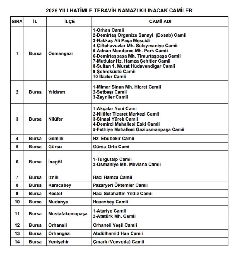 BURSA (İHA) – Bursa İl Müftülüğü, 2026 Ramazan ayı boyunca Bursa genelinde hatimle teravih namazı kılınacak camilerin listesini açıkladı. Açıklamaya göre, merkez ve ilçeler dâhil toplam 14 ilçede belirlenen camilerde teravih namazları hatimle eda edilecek.