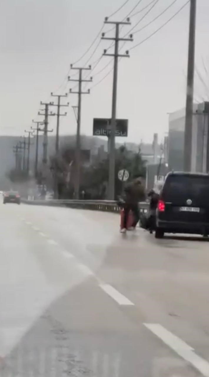 Bursa’nın Kestel ilçesinde seyir halindeki sürücü ile kurye arasında çıkan kavgada tekme ve yumruklar havada uçuştu. Araçtan inen sürücü, motokuryeyi darp ederken, kadınlar olayı ayırmak için var gücüyle çabaladı. Araçtan inen bir çocuk ise o anları şaşkınlıkla izledi.