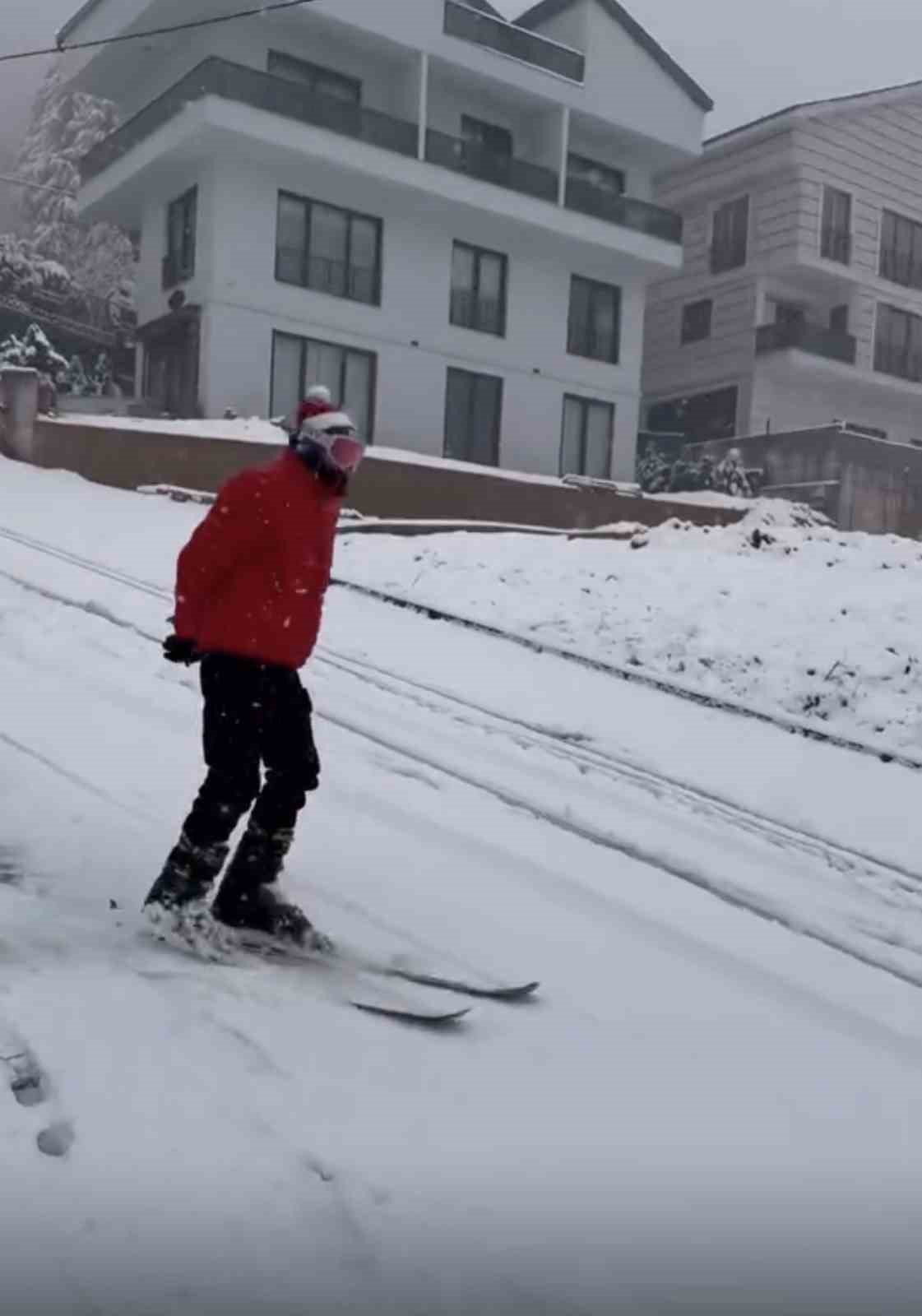 Bursa’da şehir merkezine yağan karı fırsata çeviren bir kişi, kayak takımıyla yokuş aşağı kayarak renkli görüntüler oluşturdu.