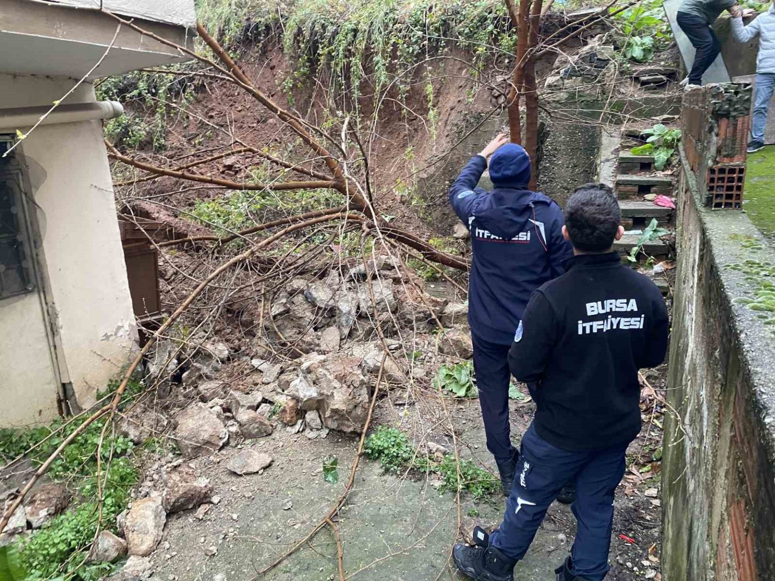 Olay, Osmangazi ilçesi Kükürtlü Mahallesi Emir Abdulkadir Caddesi üzerinde meydana geldi. Edinilen bilgilere göre, günlerdir aralıksız devam eden yağışlar nedeniyle zeminin yumuşaması sonucu istinat duvarı çöktü. Çökme sırasında bahçede bulunan ağaçlar da kökünden sökülerek binaya doğru devrildi. İhbar üzerine olay yerine ilgili belediye ekipleri sevk edildi. Ekipler çevrede güvenlik önlemleri alırken, muhtemel yeni bir risk oluşmaması için bölgede teknik inceleme başlatıldı. Olayda herhangi bir can kaybı ya da yaralanma yaşanmadığı öğrenilirken, ekiplerin bölgedeki kontrol ve güvenlik çalışmaları devam ediyor.