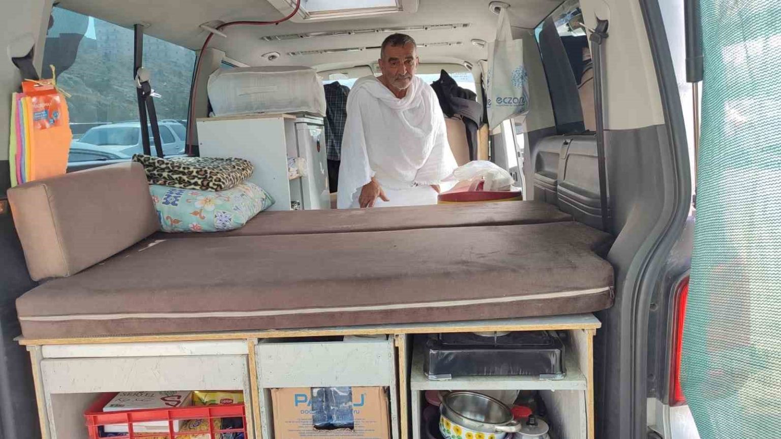 3 ay önce aracını karavana çeviren Özgür, Mekke’deki günlük yaşamını da kendi imkanlarıyla sürdürüyor. Banyo, tuvalet, su ve yemek konusunda herhangi bir sıkıntı yaşamadığını belirten Özgür, “Yemeğimi kendim yapıyorum. Türkiye’den gelirken kuru gıdalarımı getirdim” ifadelerini kullandı.