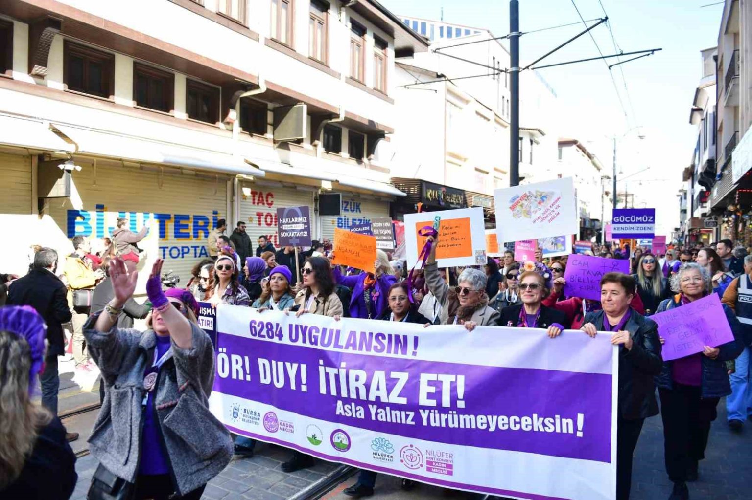 “Saklandığımız yerde değil, buluştuğumuz yerdeyiz. Birbirimizin çaresiyiz” sloganından hareketle Osmangazi Belediyesi, Büyükşehir Belediyesi, Nilüfer Belediyesi ve kent konseylerinin kadın meclisleri öncülüğündeki 8 Mart Dünya Kadınlar Günü yürüyüşü, yoğun bir katılım ile organize edildi. Cumhuriyet Caddesi’nden başlayan yürüyüşe katılan kadınlar, Hanlar Bölgesi’ne kadar alkışlar ve ıslıklar eşliğinde ilerledi. Kadınlar, “Dünya yerinden oynar, kadınlar özgür olsa”, “Susmuyoruz, korkmuyoruz, itaat etmiyoruz” sloganlarıyla tepkilerini dile getirirken, haklarının savunucusu olacaklarını hep birlikte ifade etti.